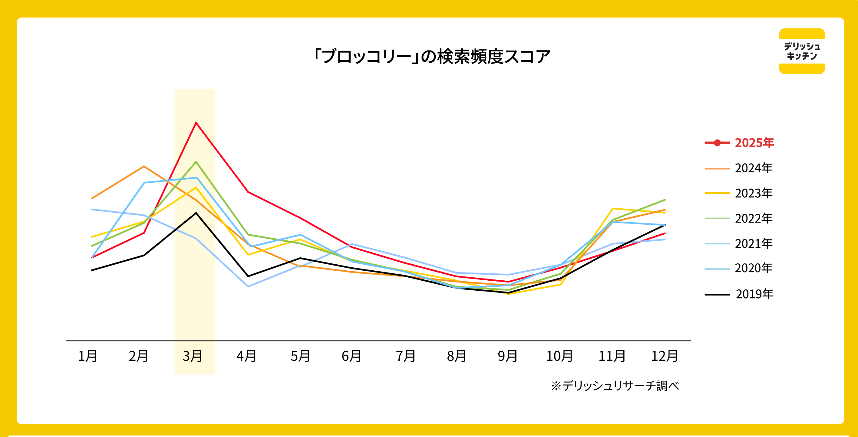 ブロッコリーの検索頻度、毎年11月から増加し3月がピーク。2025年は2019年比で1.7倍に。