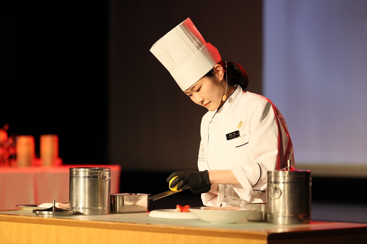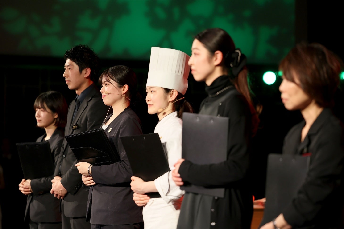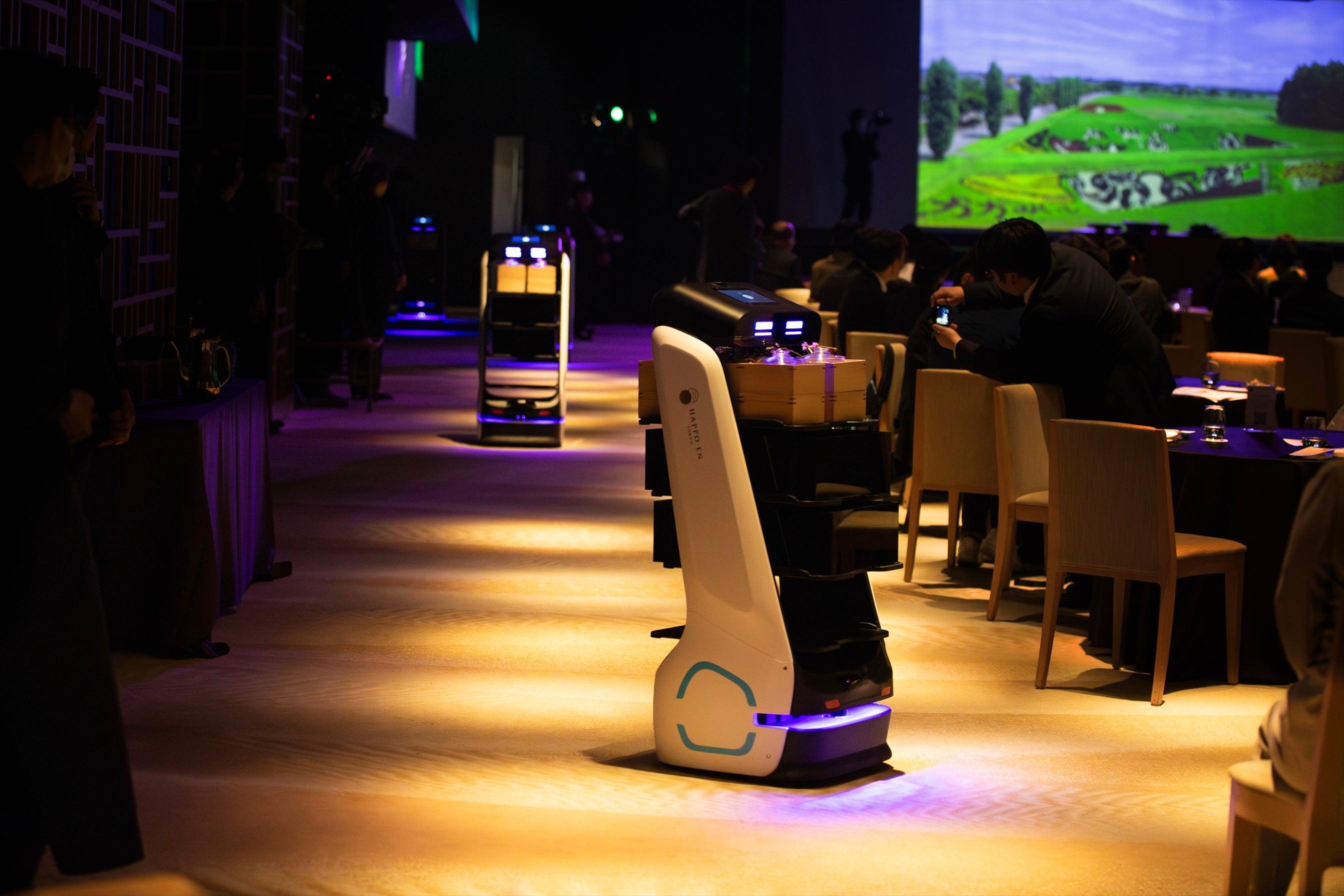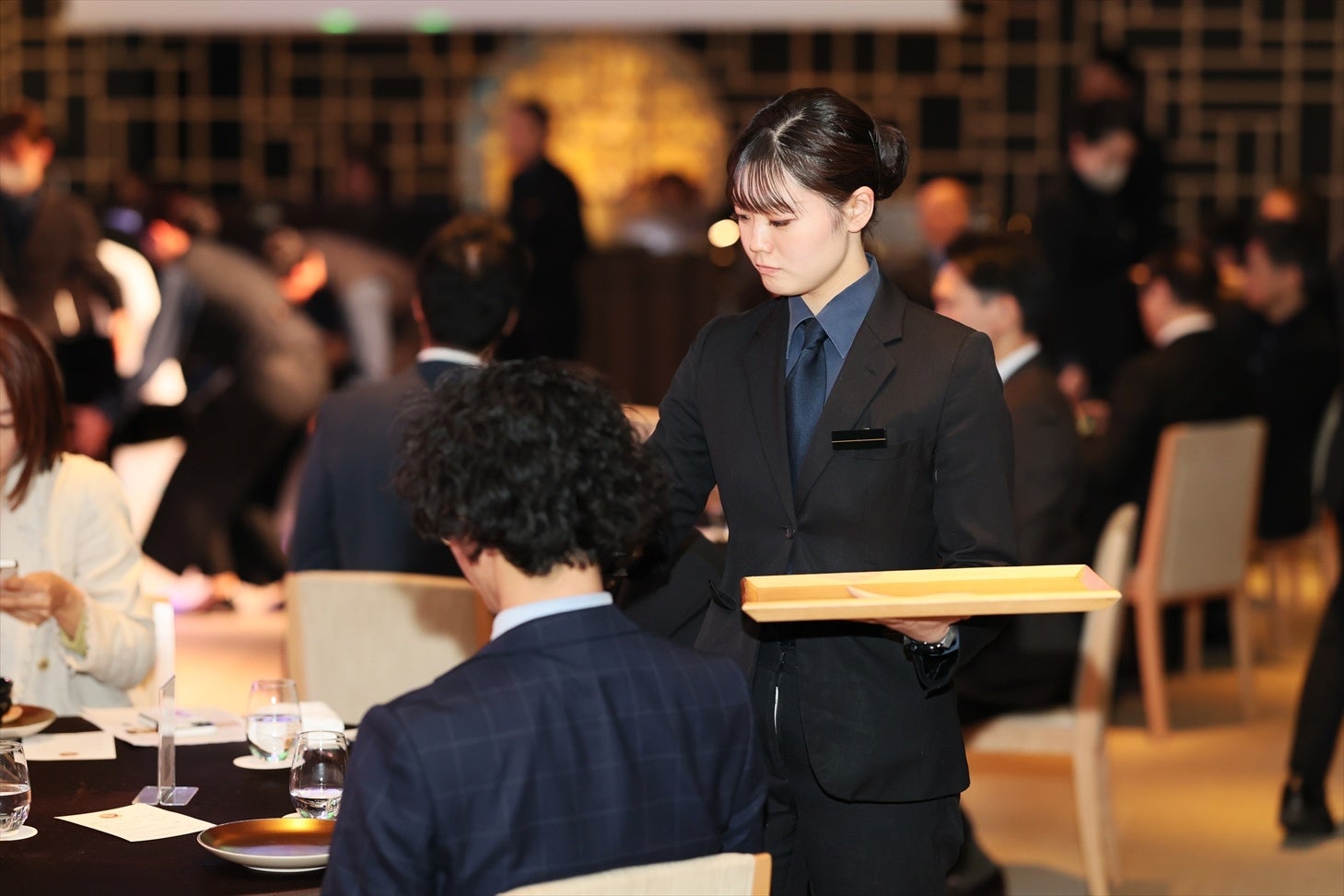 また、今回のコンテストでは、各チームが考案したコースメニューの中から一品、ゲストの皆様にご試食していただきました。料理をご提供したのは、ソフトバンクロボティクス株式会社が展開する配膳・運搬ロボット「Keenbot T5 Laser」8台。ゲストのテーブルの近くまで料理を運び、最後はサービススタッフの手により料理が届けられます。Delivery train(デリバリートレイン)という運用モデルを活用して、「Keenbot T5 Laser」での8台同時稼働および"宴会場"での稼働は日本初の試みとなりました。