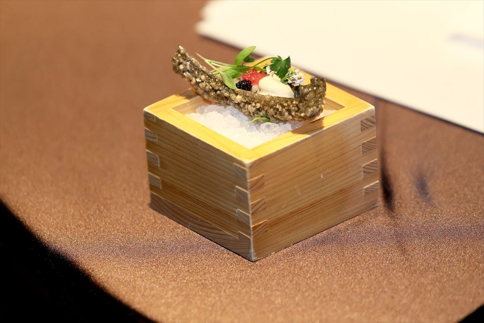 フランス語で”太陽の下で”を意味する”au soleil”と名付けたコース料理「MIYAZAKI CUISINE -Au soleil-」より、黒いチュイールで青島の周りに広がる岩で形成された海岸「鬼の洗濯板」を表現し、宮崎市の生産グループ「Sunshine Caviar(サンシャインキャビア)」様が栽培に挑戦している“フィンガーライム”を使用したアミューズをご提案し、会場内にてご用意。さらにプレゼンテーションでは、宮崎市の伝統野菜“佐土原ナス”と宮崎牛を使用したメイン料理をご提案しました。