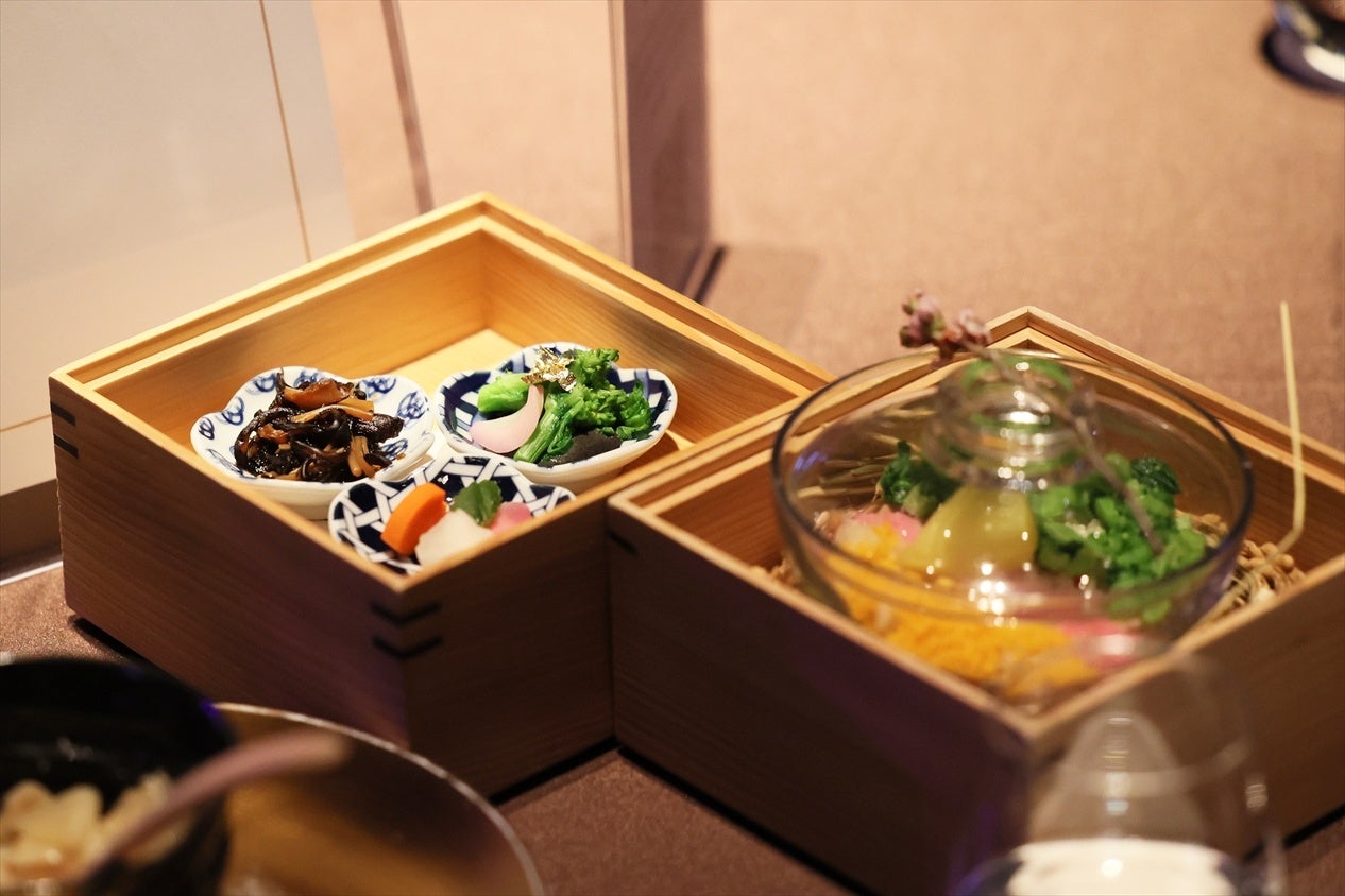 鏡石町の“田んぼアート”から着想を得て、アートをテーマに「KAGAMIISHI CUISINE -アート-」をコース料理としてご提案。“田んぼアート”をイメージした鮮やかな土鍋ごはんをご用意し、ゲストへの感謝の想いを込めて、お米と出汁を土鍋に注ぐセレモニーを行います。土鍋ごはんの中心には、かつてオランダから友好の証として送られた“鐘”をモチーフに、おふたりとゲストとのご縁を表現しました。