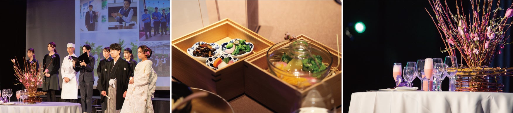 第3回目となる今年の『BEST PRODUCER CONTEST』では、八芳園にてブライダルに携わる参加企業より6ジャンル総勢137名が参加し、2次にわたる予選を経て、ファイナリスト18名が決定。従来の八芳園を会場とした結婚式のプロデュースではなく、八芳園と連携協定・パートナーシップ協定を締結する3自治体〈宮崎県宮崎市、福島県鏡石町、栃木県那須塩原市〉の各3チームに分かれ、地域を舞台に創り上げた結婚式のプロデュースを披露。自治体や生産者の皆様をはじめ地域の皆様の多大なご協力のもと、結婚式を通じて様々な地域資源を磨き上げ、新たな地域の可能性をプレゼンテーションいたしました。