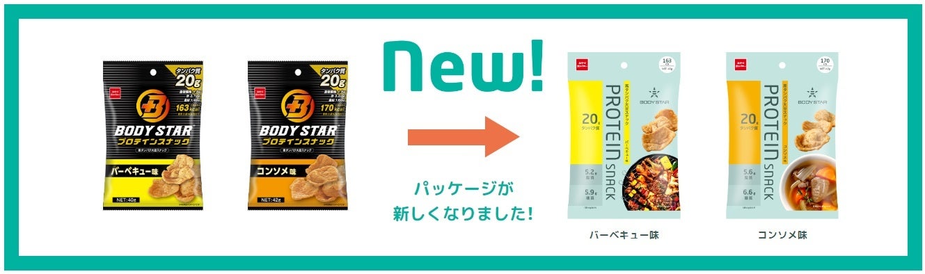 味は「バーベキュー味」「コンソメ味」の2種類。「バーベキュー味」は、1袋(40g)でタンパク質20g・脂質5.2g・糖質5.9g、「コンソメ味」は1袋(42g)でタンパク質20g、脂質5.6g、糖質6.6gと気になるPFCが一目で分かるパッケージにリニューアルします。