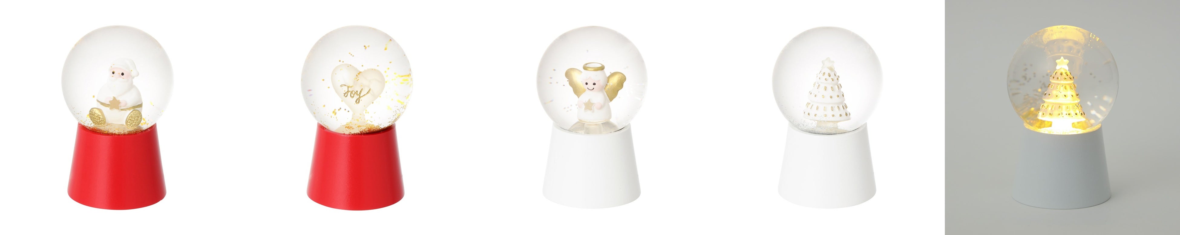 クリスマスモチーフのオブジェを閉じ込めた、優しく光るスノードームです。底面のスイッチを入れるとふんわりと光り、温かみのある雰囲気に。いくつか並べて飾るとより一層華やかなクリスマスシーンを楽しめます。