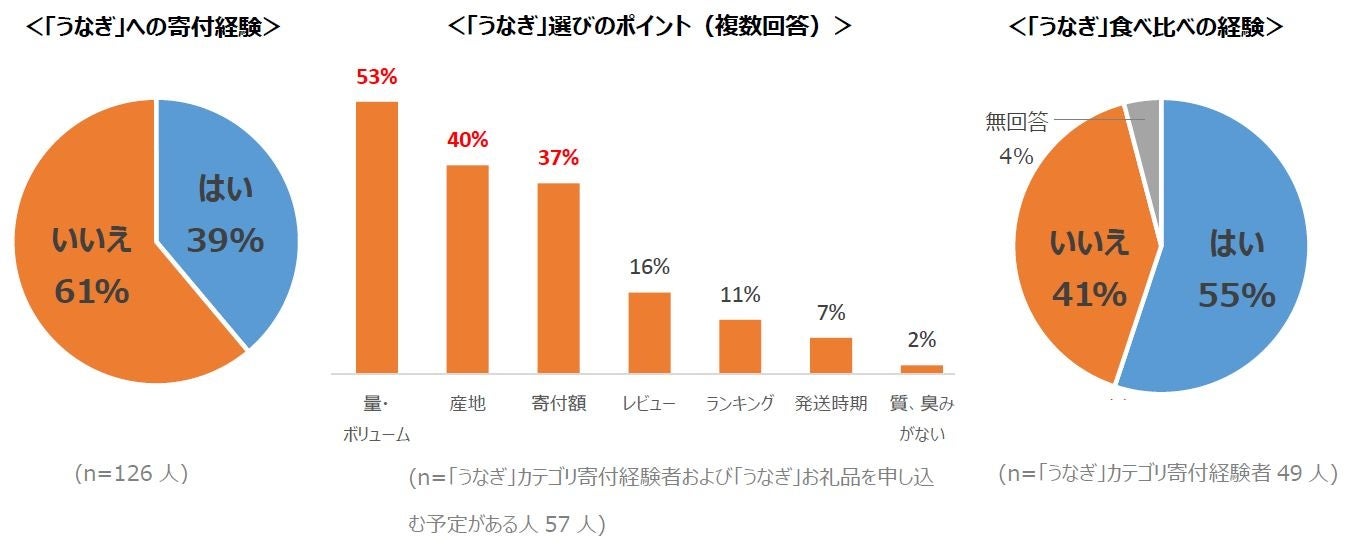 また、「うなぎ」カテゴリお礼品へ寄付したことがある人のなかで、ふるさと納税で「うなぎ」の食べ比べをしたことがある人は約4割にのぼることが分かりました。焼き方や味付けのほか、産地による違いを楽しみたいという声もあり、ふるさと納税を通じ、各地域のうなぎの違いを楽しんでいることが分かります。