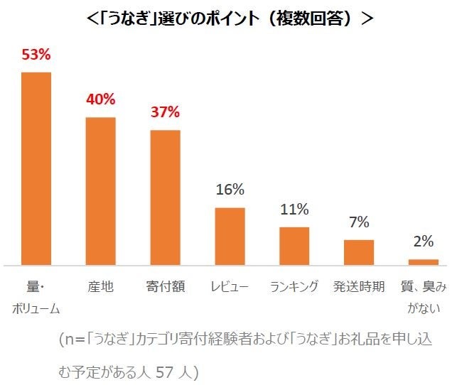 「さとふる」は、20代以上126人を対象に、ふるさと納税の「うなぎ」に関するアンケート調査を2022年6月10日(金)~6月14日(火)に実施しました。ふるさと納税で「うなぎ」カテゴリお礼品へ寄付したことがある人は全体の約4割で、うなぎを選ぶポイントとしては「量・ボリューム」が最も高く、次いで「産地」の回答が続きました。