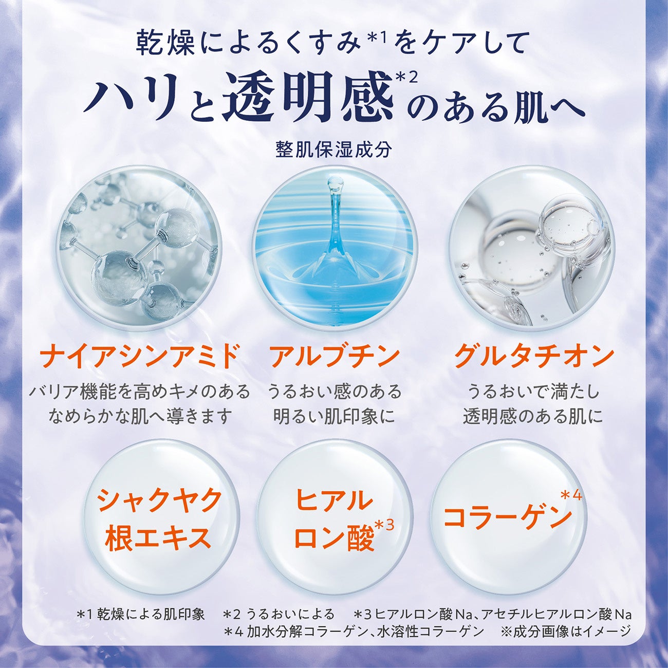 整肌保湿成分が乾燥によるくすみ(*2)をケア。ハリと透明感(*3)のある白玉肌(*4)へ。
