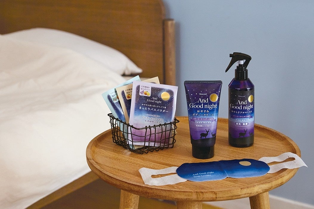 良い眠りは良い準備から。「入浴・沈静・芳香浴」の3stepと天然精油の安らぎアロマでおやすみ前のナイトケアルーティンを提案する『アンドグッドナイト』。心地よい明日へつなぐ、リラクゼーションアイテムが揃います。