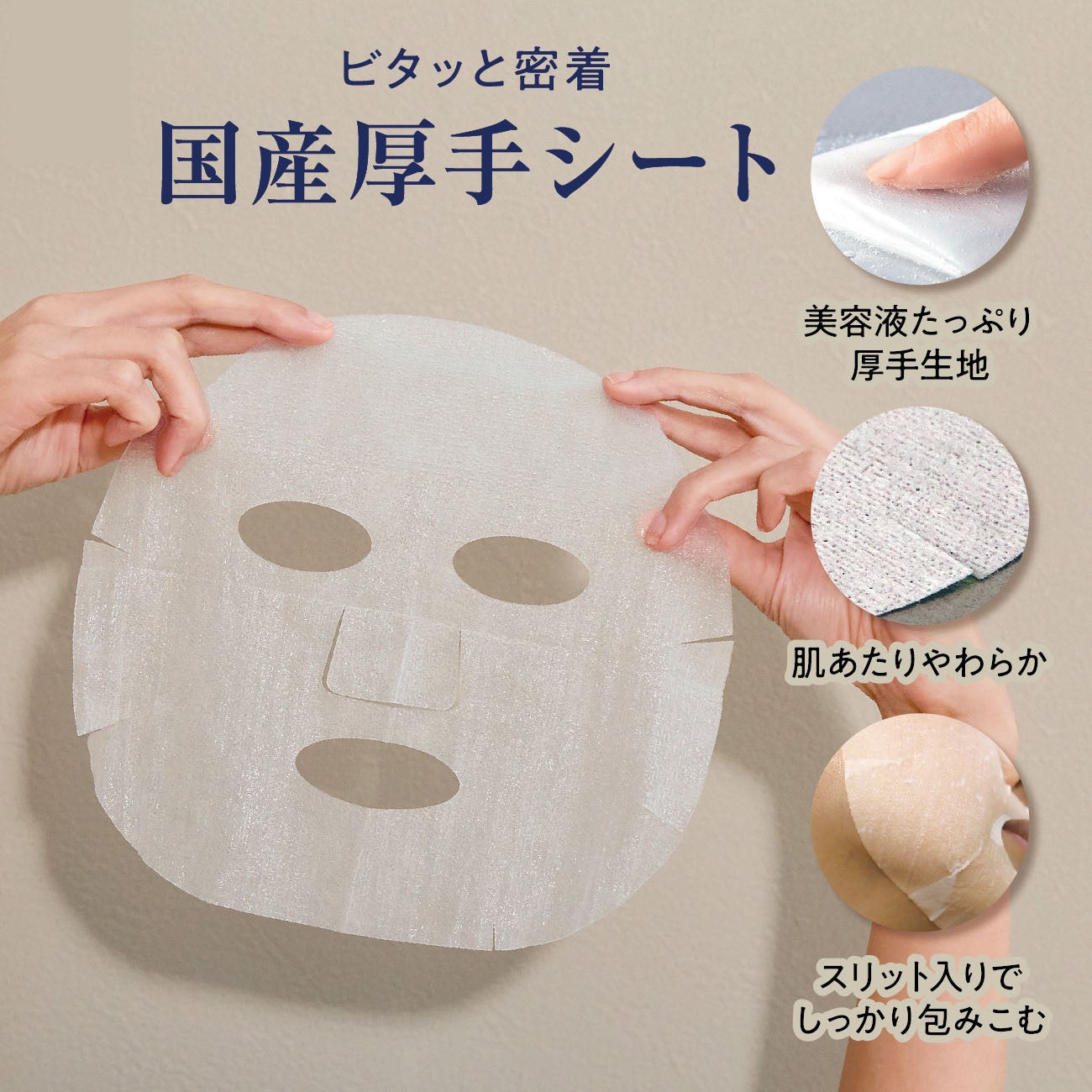 肌あたりやわらかな国産厚手シートが美容液をたっぷりと含んで肌に密着。スリット入りで顔全体をとらえてしっかりと包み込みます。