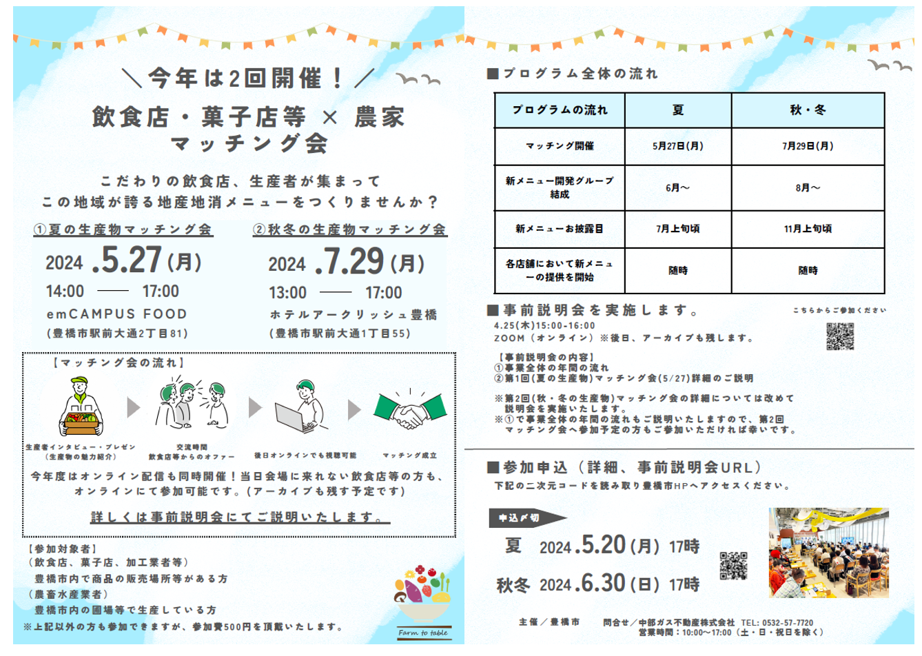 農業が基幹産業の一つである愛知県豊橋市では、新鮮でおいしい地元産農畜水産物の地産地消を促すため、新メニューを開発する生産者と飲食店、菓子店とのマッチング会を行っています。3年目となる2024年度は規模を拡大し、5月と7月の2回、マッチング会を開催します。季節で異なる輝きを見せる地元の農畜水産物、その魅力を発信する生産者と飲食店、菓子店、加工業者等の参加をお待ちしています!