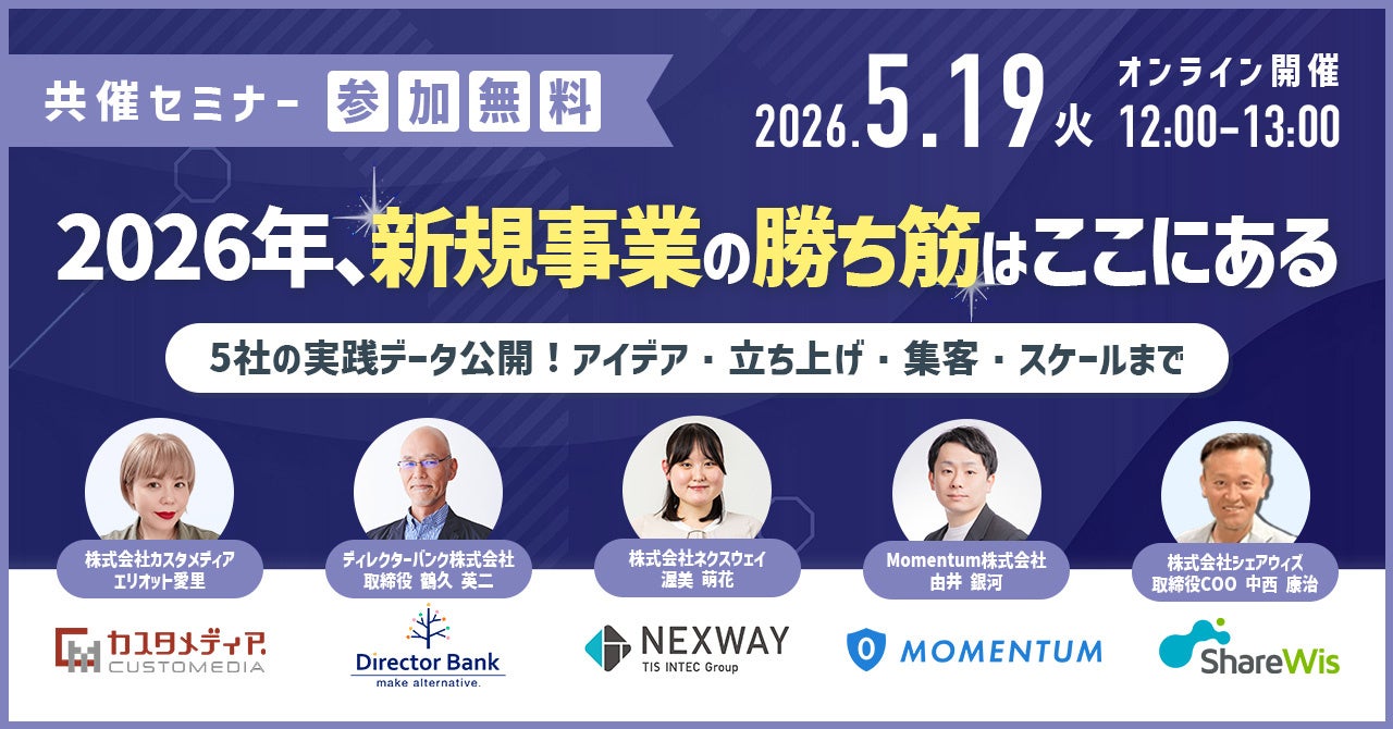 株式会社カスタメディア(本店:大阪府大阪市、代表取締役:宮﨑耕史、以下 当社)は5月19日(火)12:00から、株式会社シェアウィズ(本社: 大阪府大阪市、代表取締役 辻川 友紀)開催の無料ウェビナー【5社の実践データを公開】2026年、新規事業の勝ち筋はここにあるに登壇します。