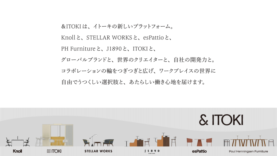 《&ITOKI》をテーマに自社ブランドと5つのグローバルブランドを展示!デザインオフィス家具のプラットフォーマーとして、より自由で上質な空間を提案