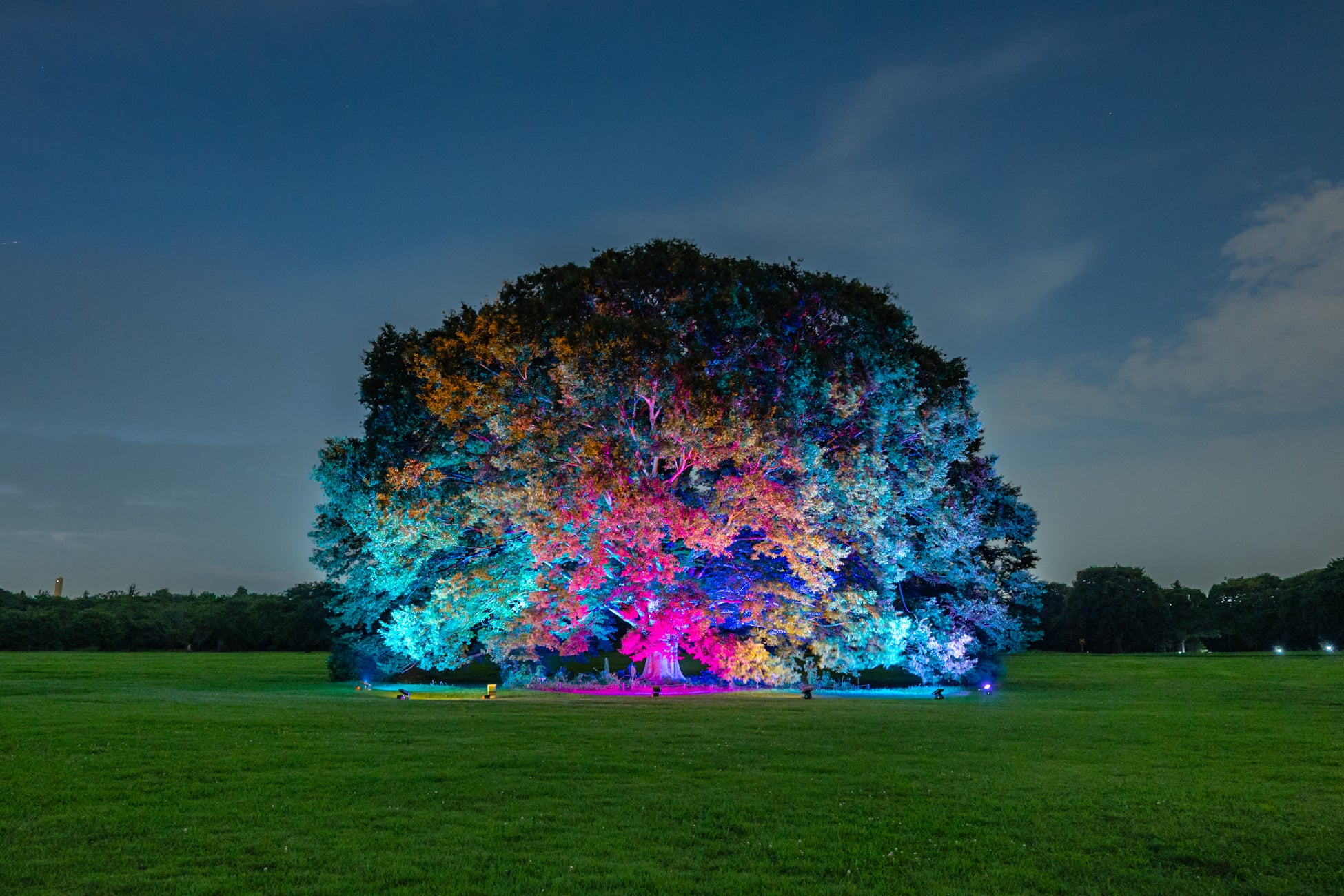 夏の代表花であるヒマワリと公園のシンボルツリーである大ケヤキをライトアップします。