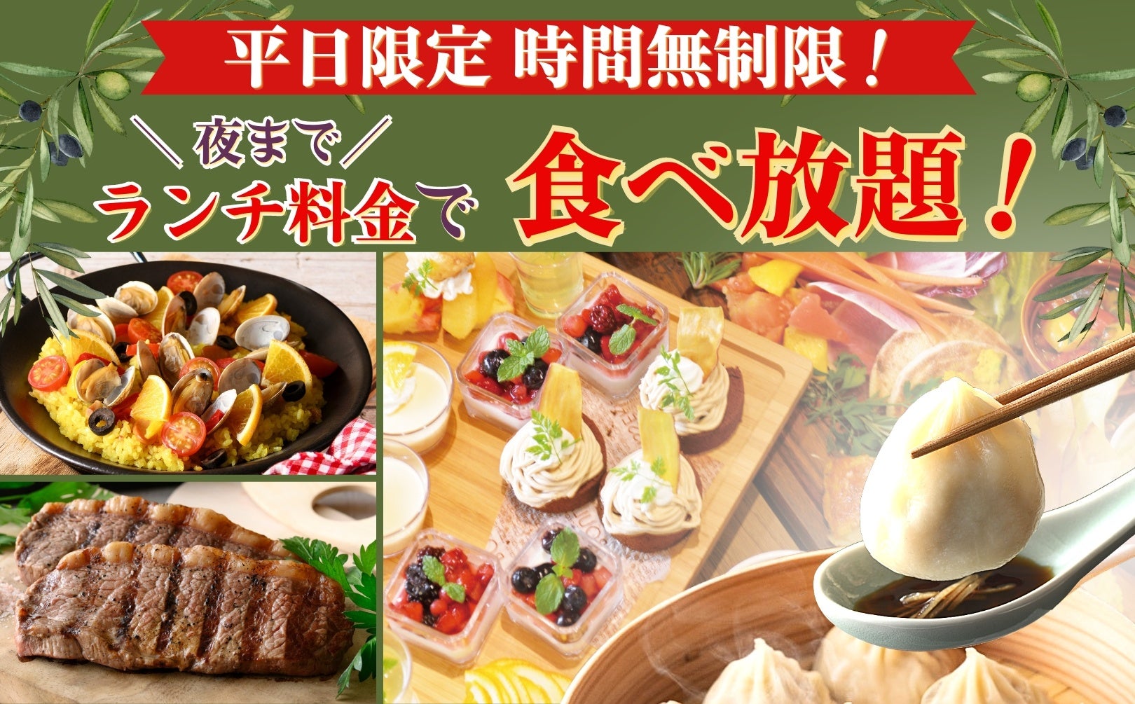 ぜひ平日は、時間無制限でゆっくりとお得に食べ放題をお楽しみくださいませ。