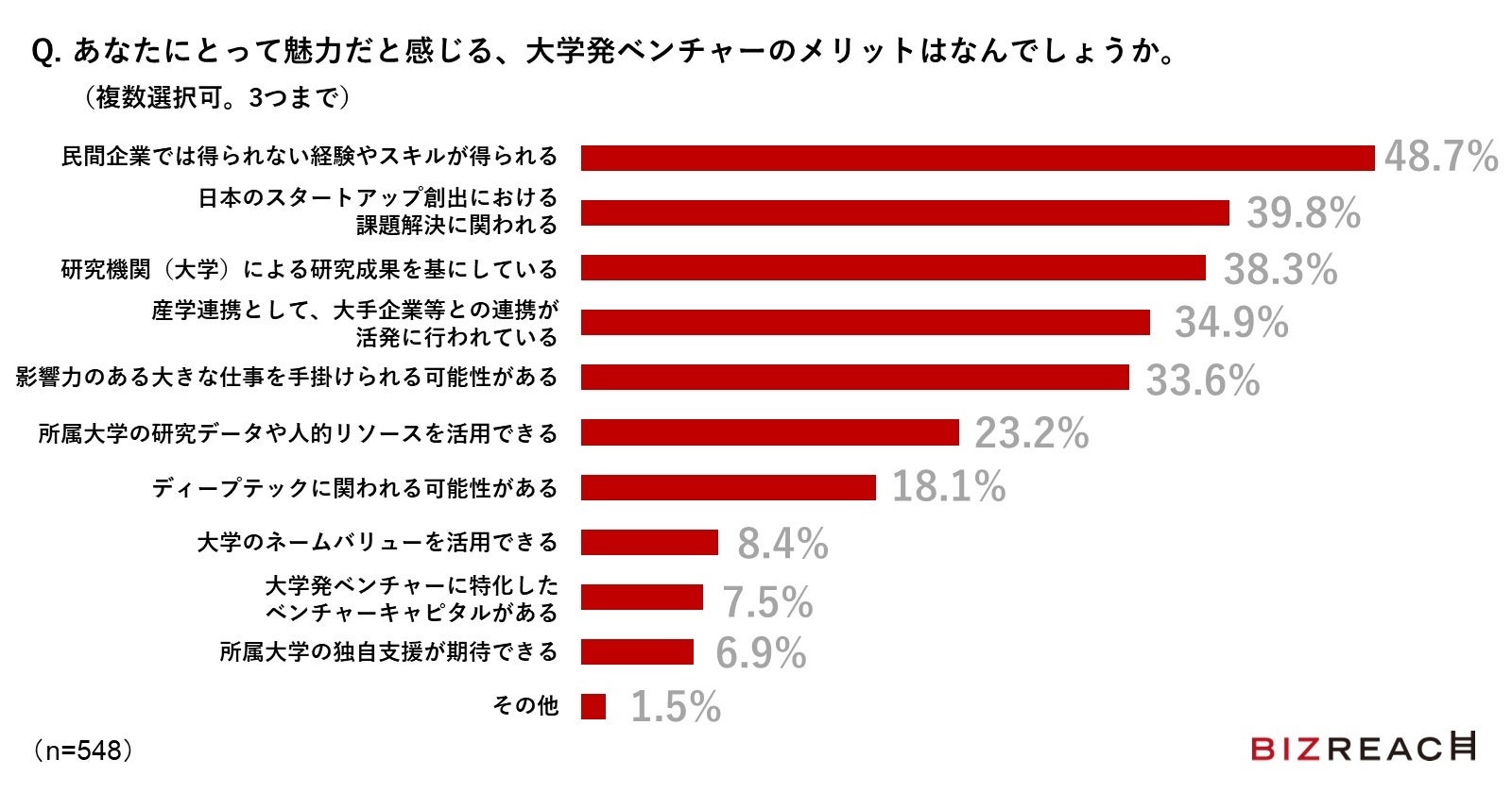 大学発ベンチャーの仕事に興味があると回答した人は69.3%にのぼりました。大学発ベンチャーに感じる魅力としては、「民間企業では得られない経験やスキルが得られる(48.7%)」が最多となり、「日本のスタートアップ創出における課題解決に関われる(39.8%)」「研究機関(大学)による研究成果を基にしている(38.3%)」が続く結果となりました。