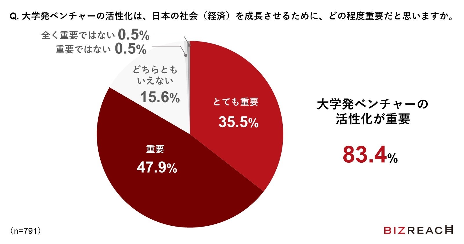 日本の社会(経済)の成長に「大学発ベンチャーの活性化が重要」だと回答したビジネスパーソンは83.4%となり、多くのビジネスパーソンが大学発ベンチャーに期待を寄せていることがわかりました。