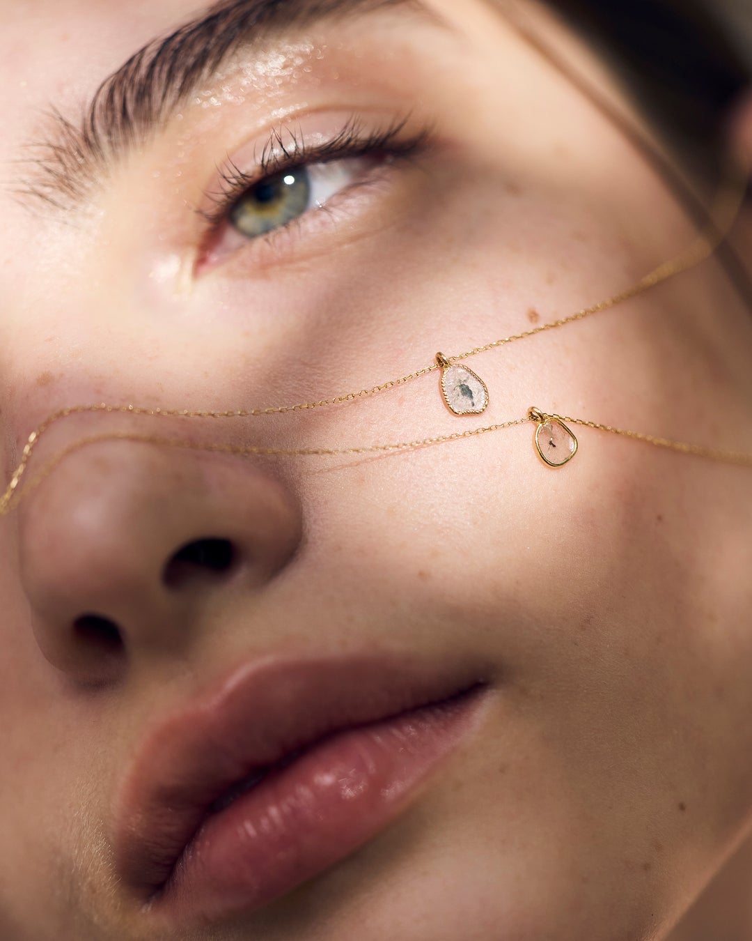 ダイヤモンドの原石を薄くスライスして磨き上げた「スライスダイヤモンド」。内包物や形が異なりひとつとして同じものはないダイヤモンドをデザイナーがセレクトし、インドの職人がひとつひとつ金で取り巻きました。石枠はミル仕上げとシャイン仕上げの2種を展開。湖に薄く張った氷のように、水面が日の光で輝くように、面できらっと輝くスライスダイヤモンドの美しさを堪能できるネックレスです。