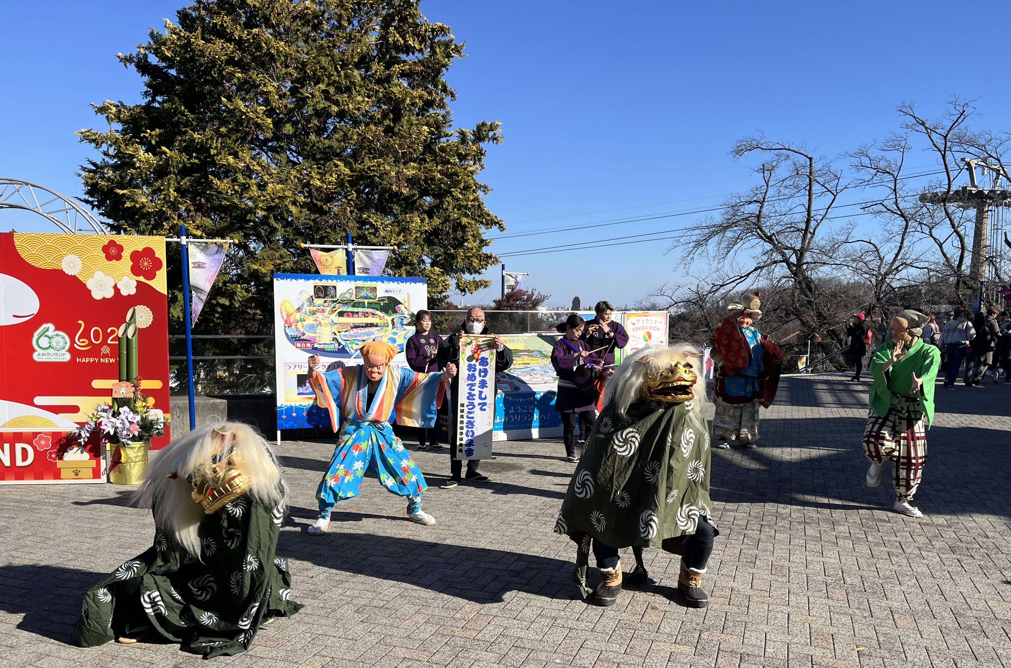 よみうりランドの地元、稲城市青渭(あおい)囃子保存会による獅子舞とお囃子の披露。新春のおめでたい気分を縁起の良い演舞で盛り上げます。