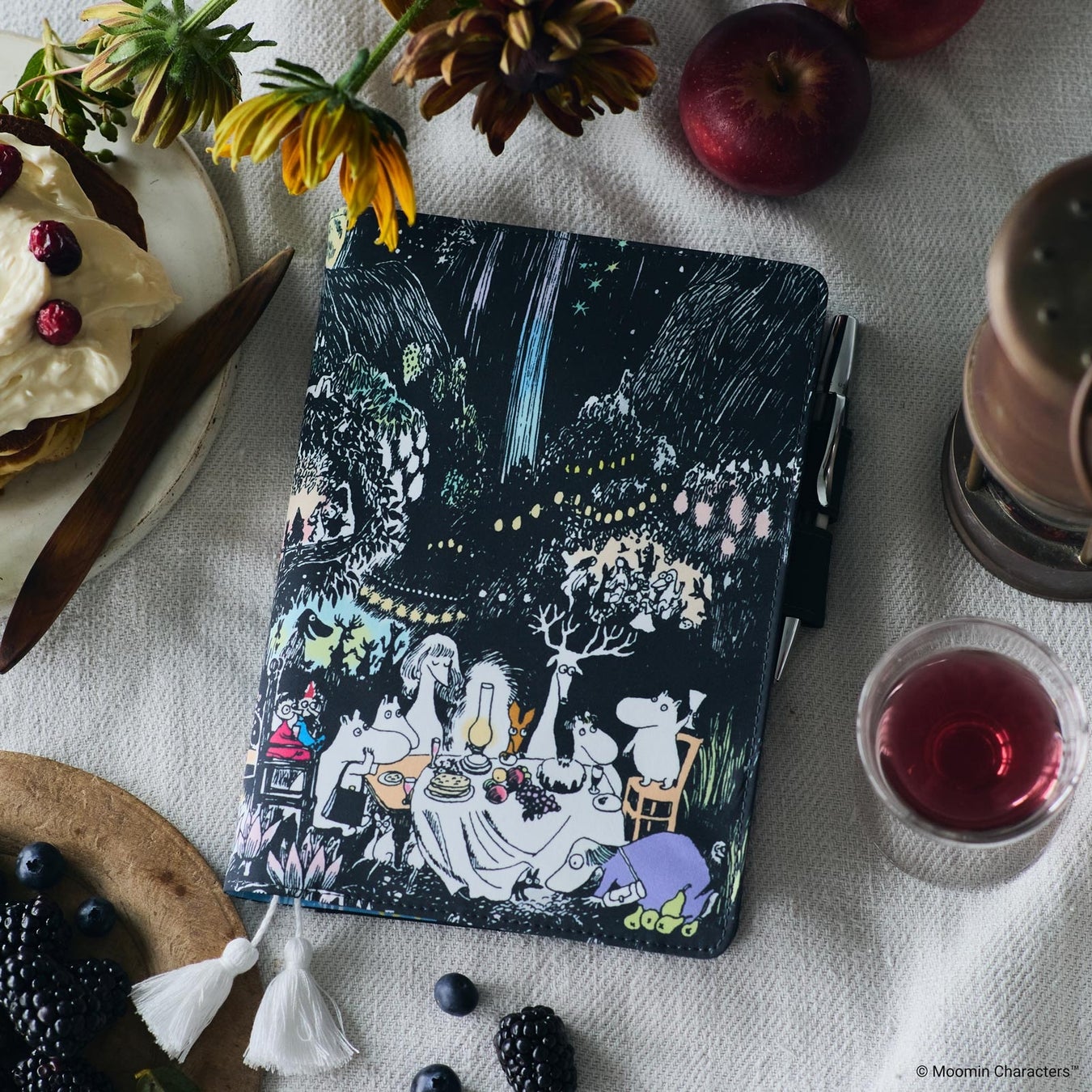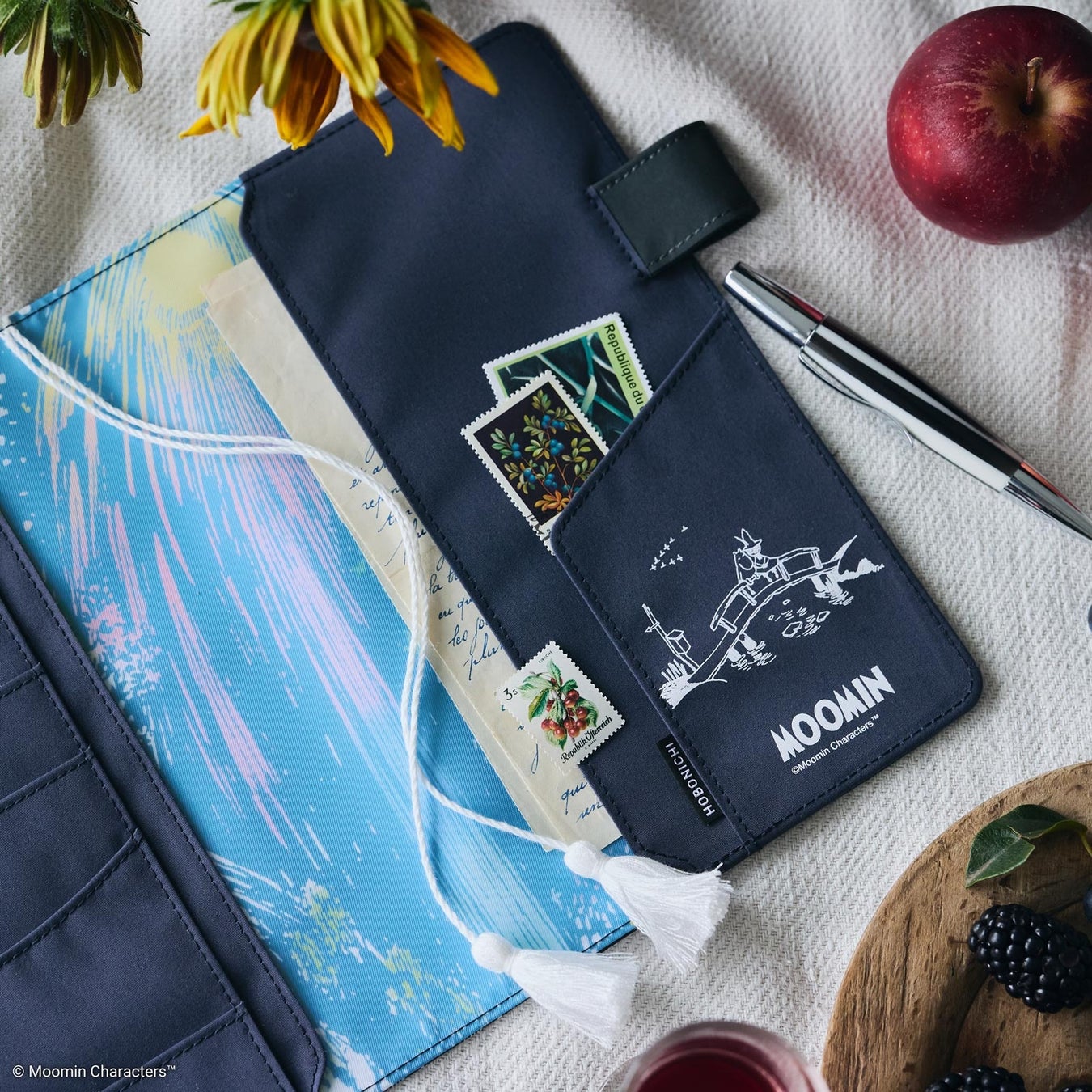 小説『たのしいムーミン一家』の挿絵を全面にプリントした手帳カバーです。内側には、カバー表紙の絵の上部に描かれていた打ち上げ花火をデザインし、しおりの先端には、ムーミンのしっぽをイメージした白いタッセルがついています。原画の細やかな線を美しく表現できるよう、キメのこまやかなポリエステル生地でつくりました。