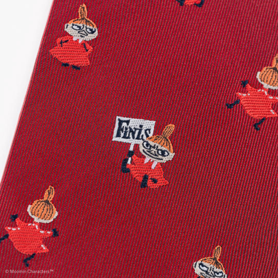 光沢があり、織り目の手触りが心地いいネクタイ生地を使用した週間手帳のweeks。落ち着いたトーンの赤い生地に、笑っていたり、怒ってたり、フルーツを食べていたりと、リトルミイのさまざまな表情やポーズを、ネクタイの織りで細部まで表現しました。