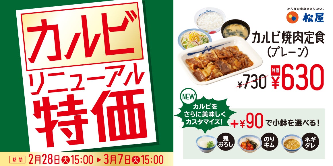 【松屋】各メニューが1週間限定で100円お得!「“お試し価格”選べるカルビ焼肉定食」 発売