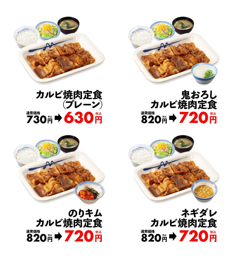 商品名 【2/28午後3時 ~ 3/7午後3時:お試し価格販売時】 カルビ焼肉定食(プレーン)※大根おろし抜き 730円 → 630円 鬼おろしカルビ焼肉定食 820円 → 720円 のりキムカルビ焼肉定食 820円 → 720円 ネギダレカルビ焼肉定食 820円 → 720円 【3/7午後3時~:お試し価格終了後】 カルビ焼肉定食(プレーン)※大根おろし抜き 730円 鬼おろしカルビ焼肉定食 820円 のりキムカルビ焼肉定食 820円 ネギダレカルビ焼肉定食 820円 ※お持ち帰りいただけます。お持ち帰りにみそ汁は付きません。 お持ち帰りの場合、みそ汁は別途60円でお求めいただけます。 ※税込み価格です。 ※現在販売中の牛焼肉定食、豚焼肉定食、豚生姜定食は、2/14(火)午後3時をもって販売終了致します。 ※2/28(火)午後3時新発売のカルビ焼肉定食4種は、3/7(火)午後3時より通常価格での販売となります。