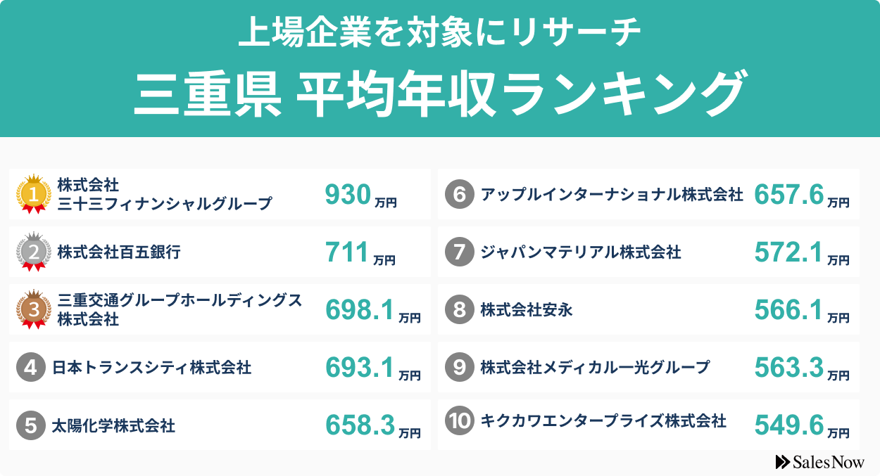 【三重県】上場企業平均年収ランキングTOP10!/SalesNow DBレポート
