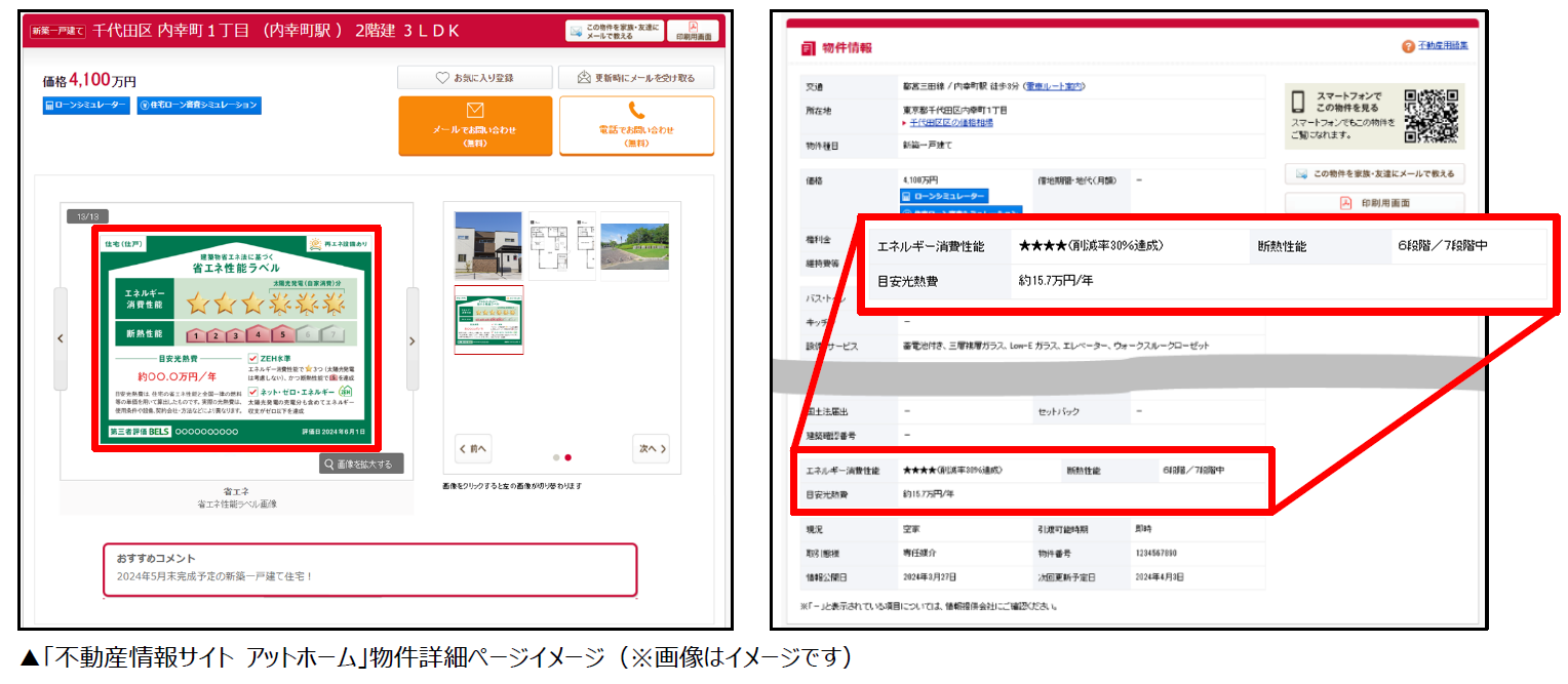 また、「不動産情報サイト アットホーム」の物件詳細ページ内の物件情報欄においても、「エネルギー消費性能」「断熱性能」「目安光熱費」の項目を追加いたします。