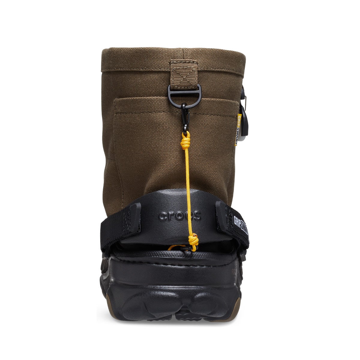 軽量なクロスライトTM素材の一体成型クロッグに、滑り止め効果のあるラグソールを装着した「Classic All-Terrain Clog」をベースに、シャフトとアッパーカバー部分には難燃素材のBLAZE SHIELDを採用し、アウトドア仕様にアップデート。(※ベースのcrocs部分は難燃素材ではございません。)