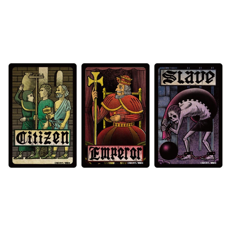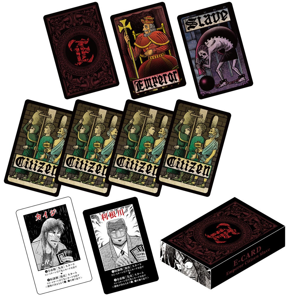『賭博黙示録カイジ』の中でもクライマックスと言えるカイジvs利根川の名勝負『Eカード』を悪魔的商品化っ・・・・!たったの3種、計10枚のカードで行なわれる勝負は、カードの内訳を超えて互いに裏の裏の裏まで読み合う極限の心理戦!耳を賭けるか?土下座を賭けるか?あの恐怖と興奮を体験できる本物のカードセットだっ・・・・!