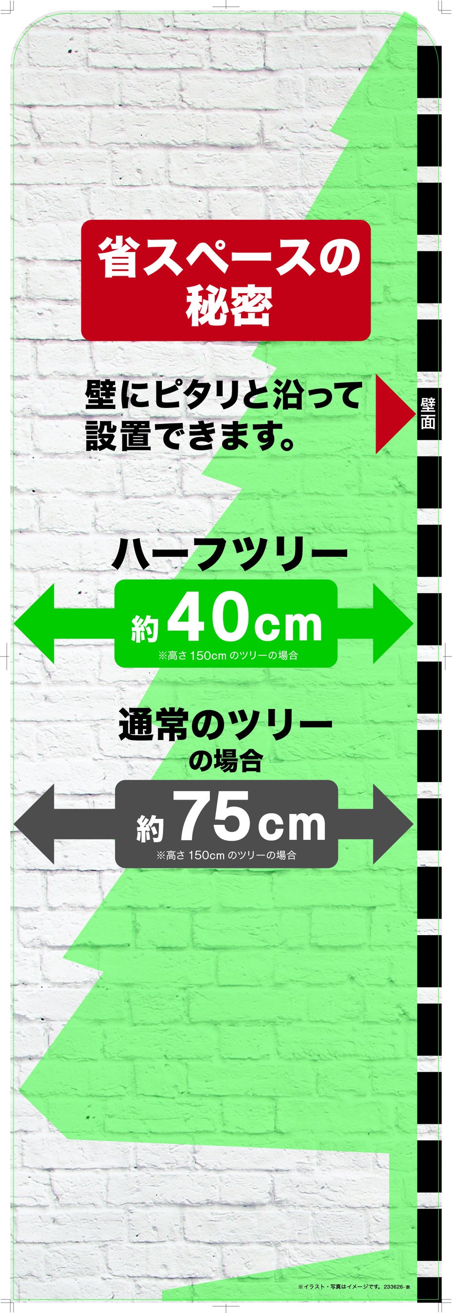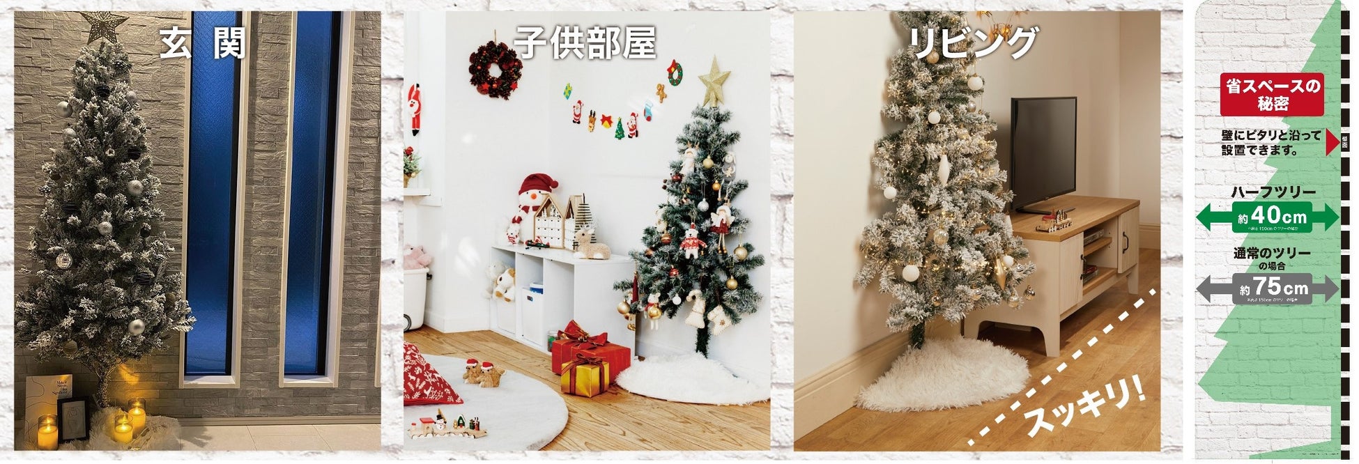 従来のツリーを半分にしたハーフツリーは、壁にぴったりつけることで、お部屋をより広く使うことができます。スペース問題で、これまでクリスマスツリーを飾りたくても飾れなかった場所や、飾らなかった場所にも飾っていただけます。半円形なので、正面から見れば、いつものクリスマスツリーと変わらない存在感です。