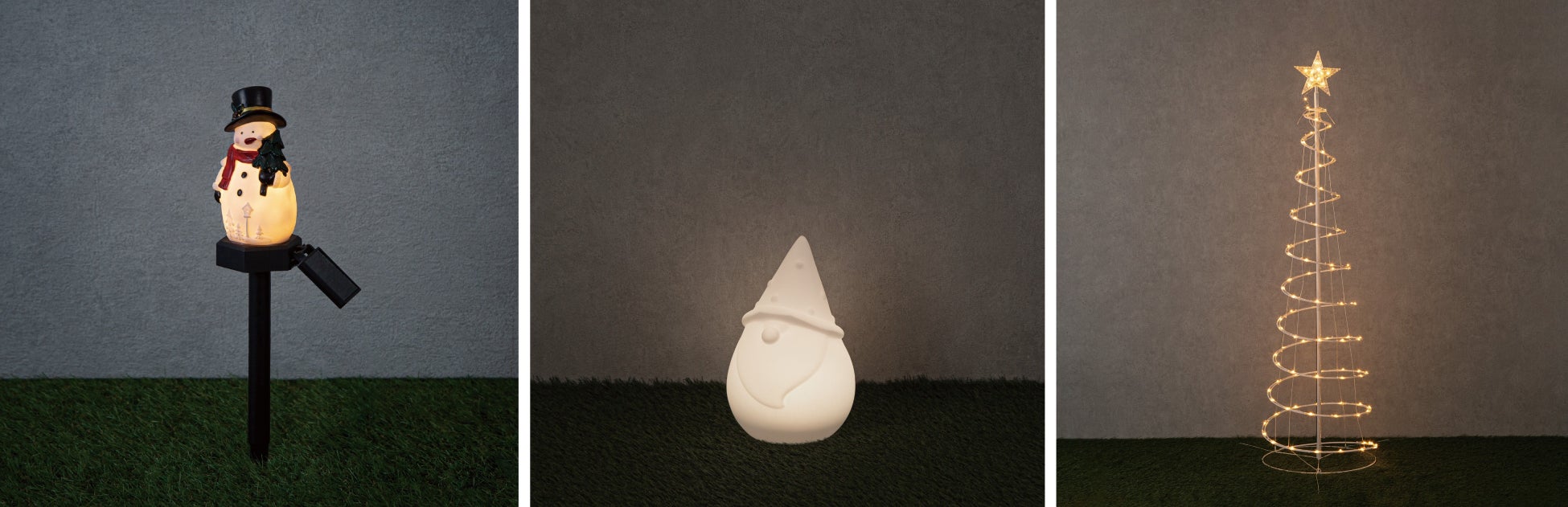 雪だるま 799円(画像左)/ラウンドサンタ 4,990円(中央)/らせんツリー 7,990円(画像右)