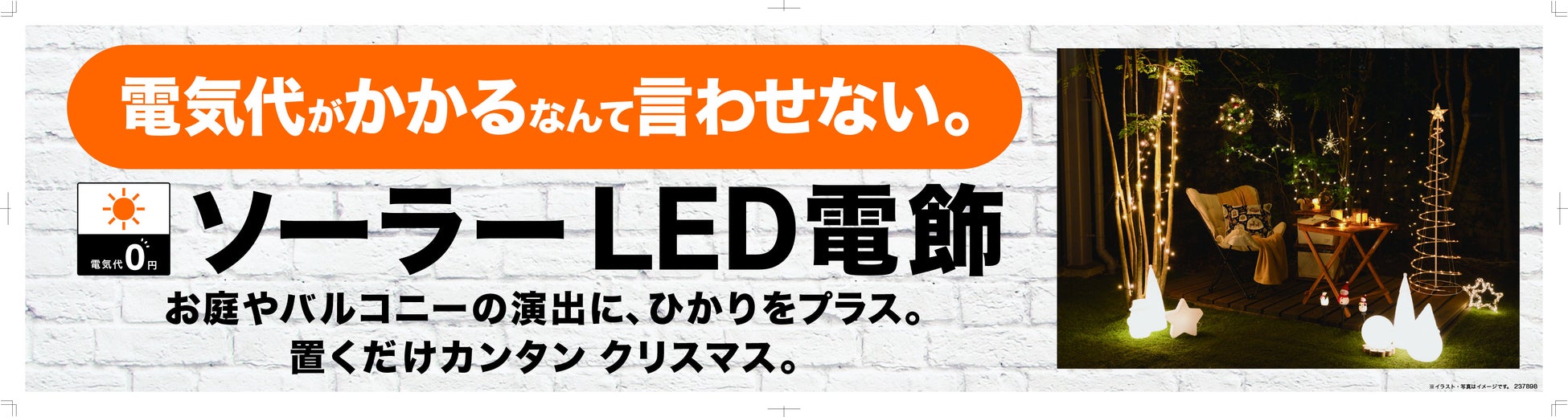 今年は、外でもクリスマスを楽しみませんか。ニトリの屋外電飾アイテムは、ソーラー充電式のLEDオーナメントなので、電気代が0円です。リビングからつながるテラスに飾ってみれば、お家の中から我が家だけのクリスマスイルミネーションが楽しめます。下記、一部アイテムをご紹介いたします。