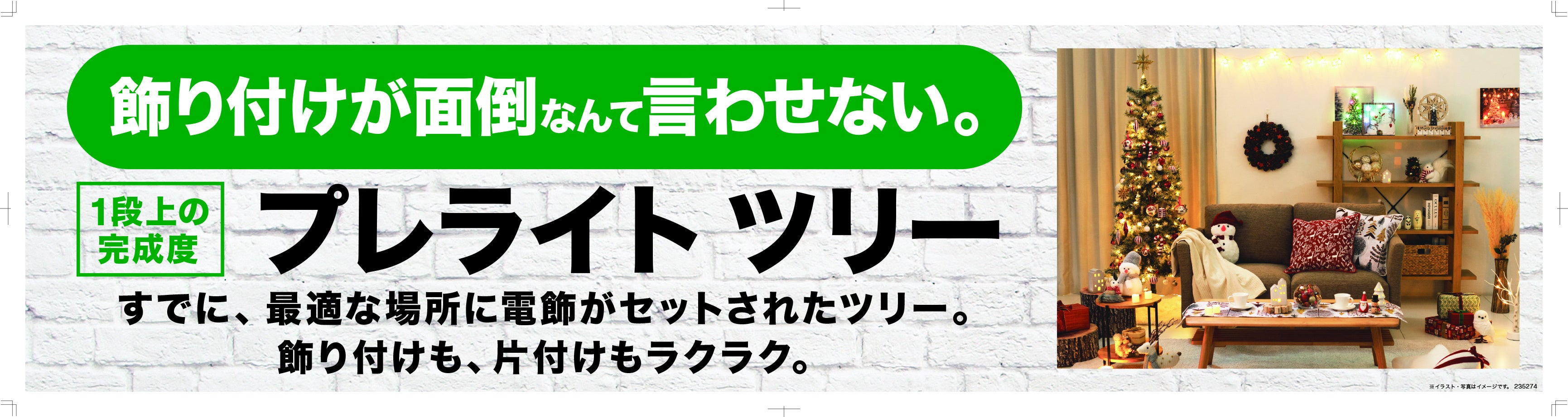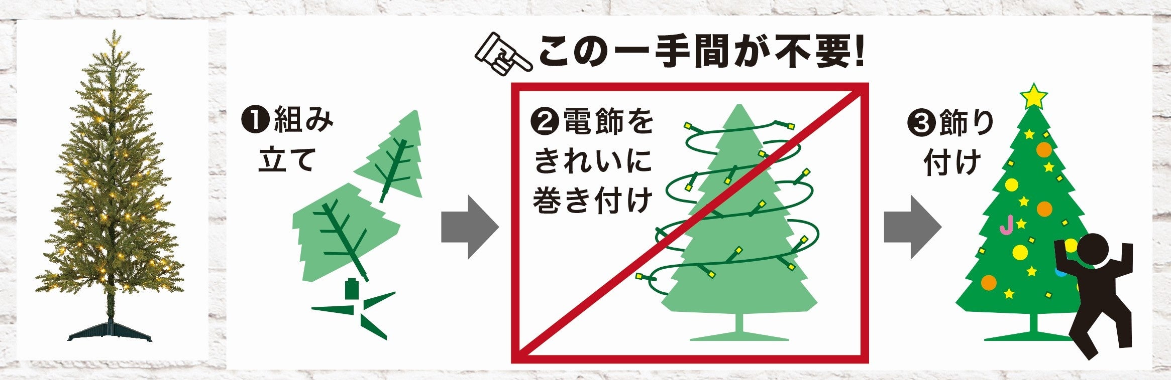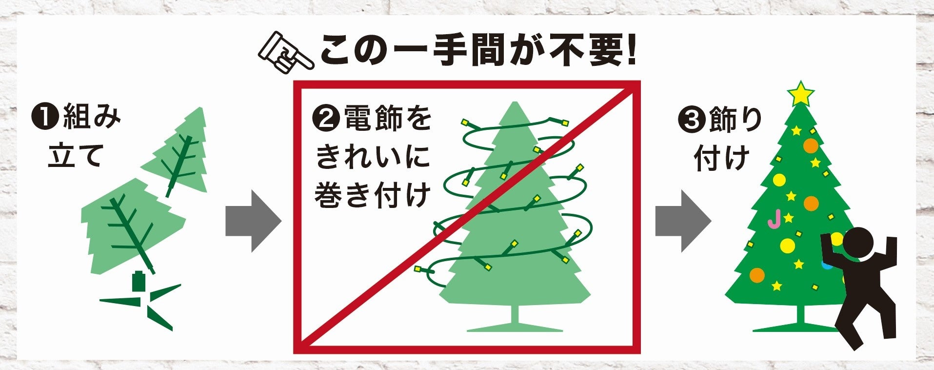 お子様と一緒に飾るクリスマスツリーの飾りつけは、気持ちがウキウキする一方で、ちょっと面倒だと思ったことはございませんか。そんな声にお応えし、電飾が最初からツリーにセットされたプレライトツリーを開発。電飾をきれいに巻き付ける手間を省いただけでなく、最適な位置に取り付けられているため、1ランク上の完成度のクリスマスツリーが簡単に飾れます。もちろん、片づけも簡単です。