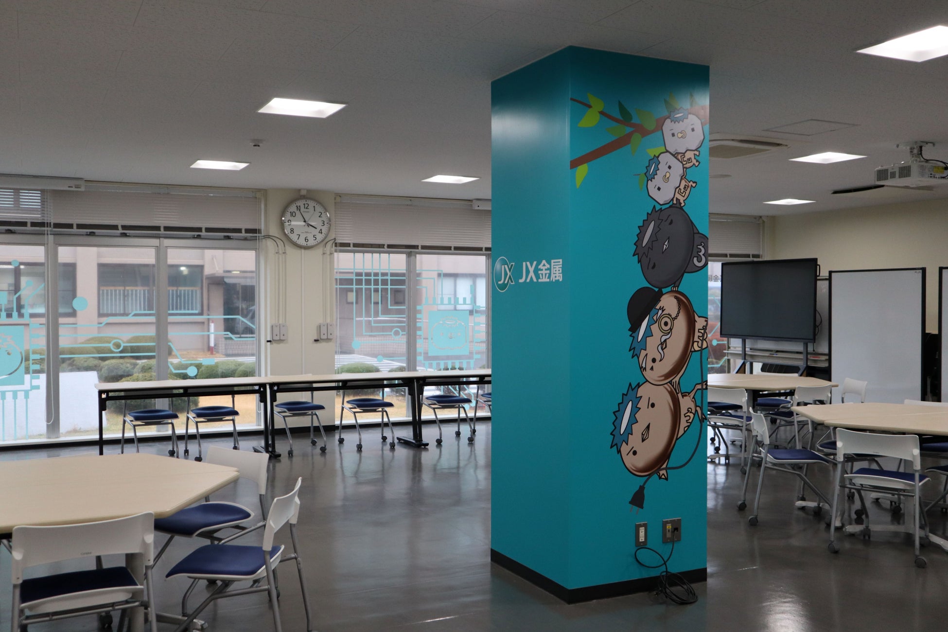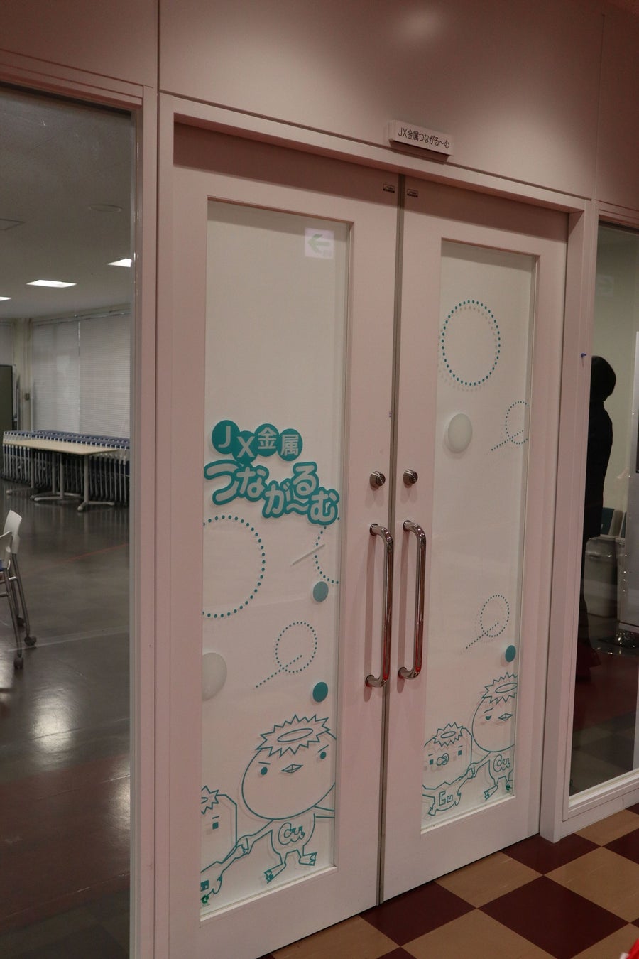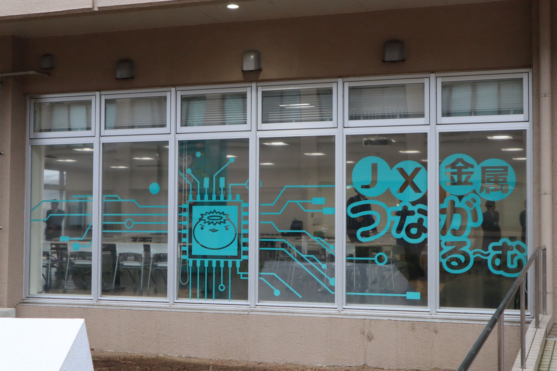 正門に近く、校内で最も目立つ図書館棟1階のセミナー交流ルームは、授業、各種イベント、自主学習など多岐にわたる用途で活用されています。今回の新名称「JX金属つながる〜む」には、茨城高専とJX金属、そして施設利用者同士の「つながり」を象徴する意味が込められています。また、JX金属が半導体材料をはじめとした、世界を「つなぐ」先端素材を開発・製造している企業であることにも由来します。契約に基づき、対象施設内の窓や柱には、JX金属PR大使の「カッパーくん」をあしらったオリジナルデザインのサインが掲示され、半導体回路などのモチーフを取り入れたグラフィックが未来志向の連携を視覚的に表現しています。