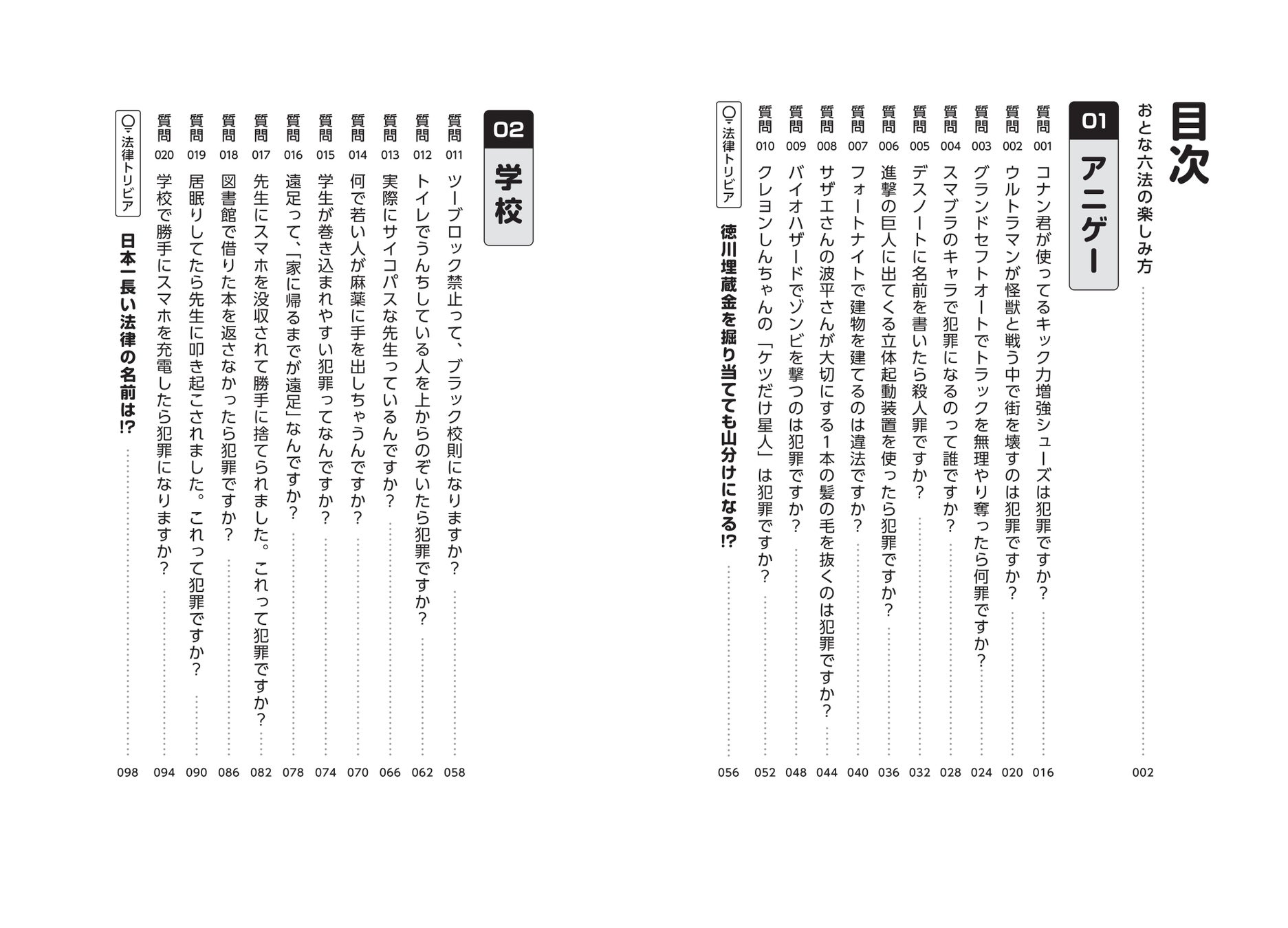 本書はそんな法律を身近に感じてもらうために、一見バカバカしい質問に回答しています。アニメ・ゲーム・学校など身近なテーマを例に出し、読んだ人が「自分事」として考えられるように工夫もしています。とかく堅くなりがちな法律知識を、カジュアルにクスリと笑いながら学べるため「おとな六法」はコンプライアンスが厳しくなった世の中では必須の教養となるでしょう。一家に1冊は備えておきたい、「おとな」も「こども」も楽しめる六法です。