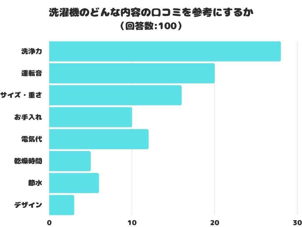 洗濯機のどんな内容の口コミを参考にするかをアンケートにて調査したところ、1位は「洗浄力」でした。