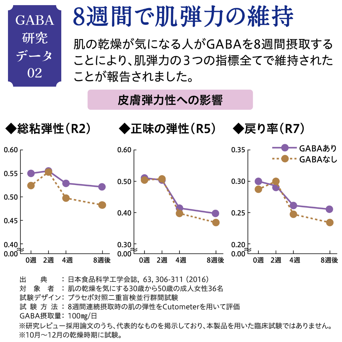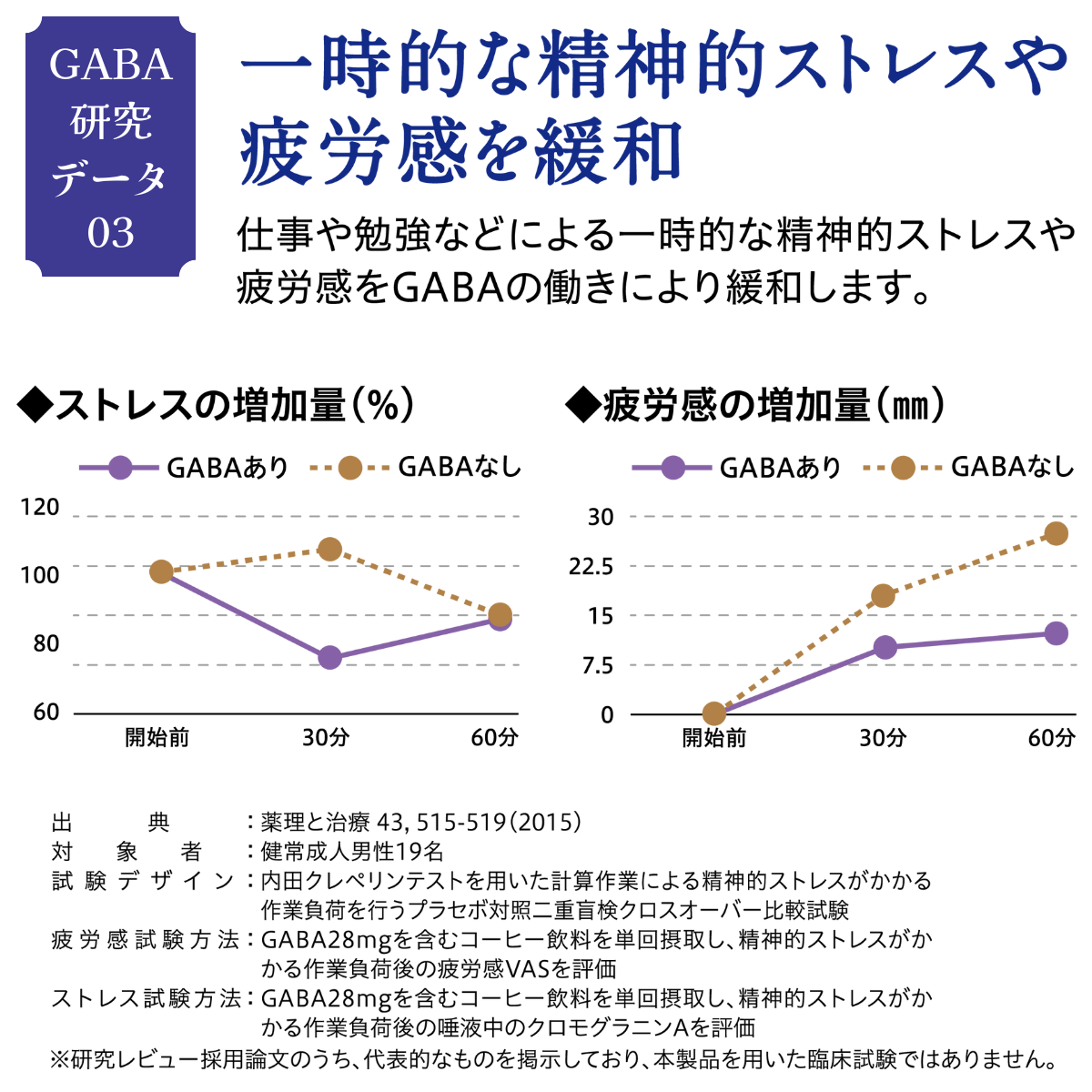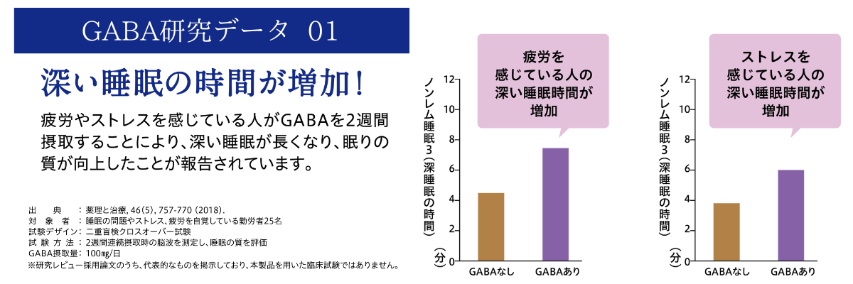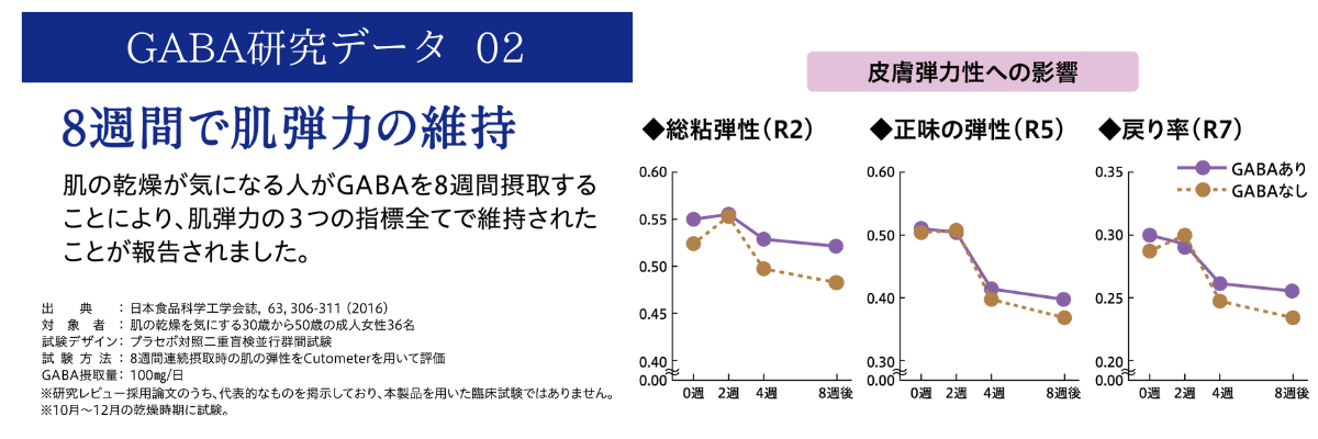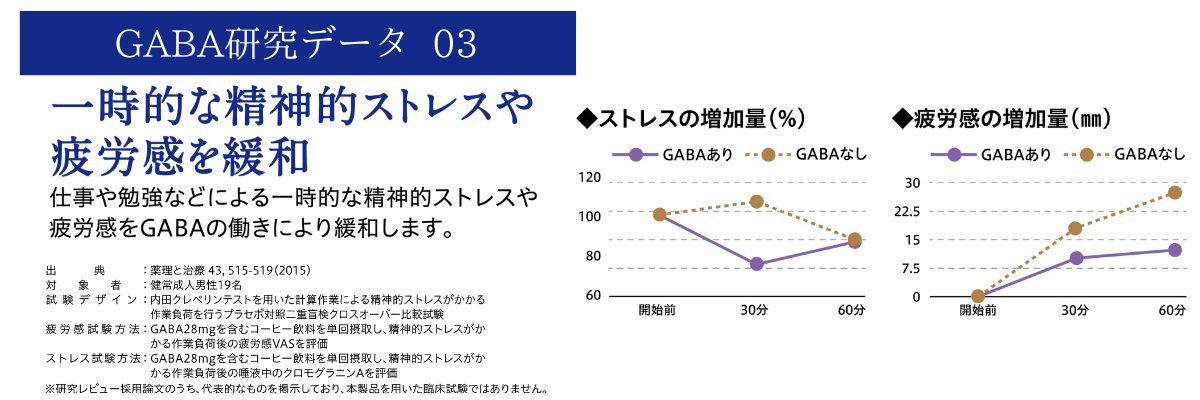 【届出表示】本品にはGABAが含まれます。GABAには、肌の乾燥が気になる方の肌の弾力を維持し、肌の健康を守るのを助ける機能、一時的な疲労感やストレスを感じている方の睡眠の質(眠りの深さ)の向上に役立つ機能、仕事や勉強などによる一時的な精神的ストレスや疲労感を緩和する機能、日常生活で生じる一時的な活気・活力感の低下を軽減することが報告されています。