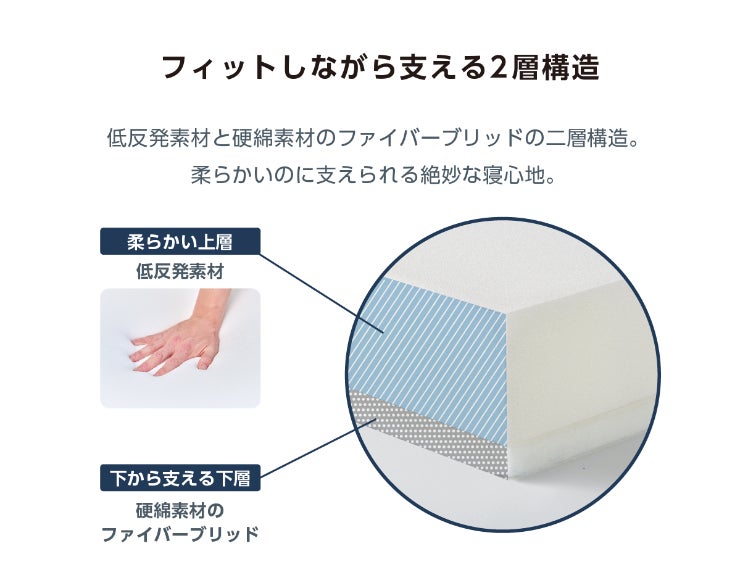 本体(マットレス・まくら)は2層構造。上層は衝撃性と復元性に優れたトゥルースリーパー独自素材「ウルトラヴィスコエラスティック」、下層は硬綿素材を採用しており、上層が身体にフィットしつつ下層でしっかり支えてくれるから無理のない寝姿勢をサポートします。