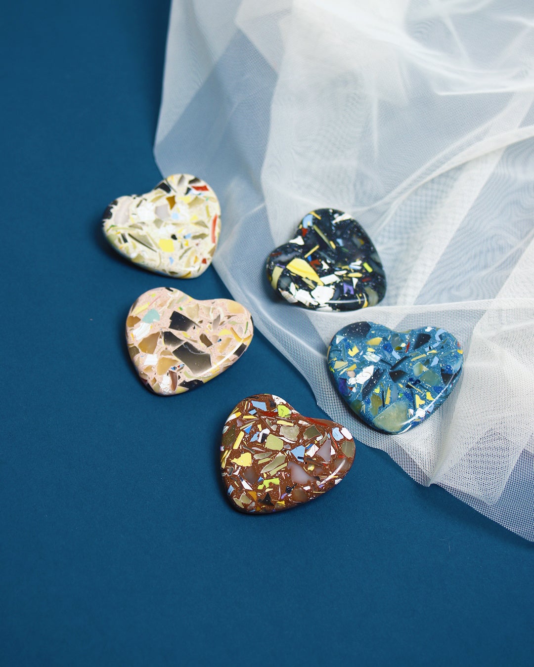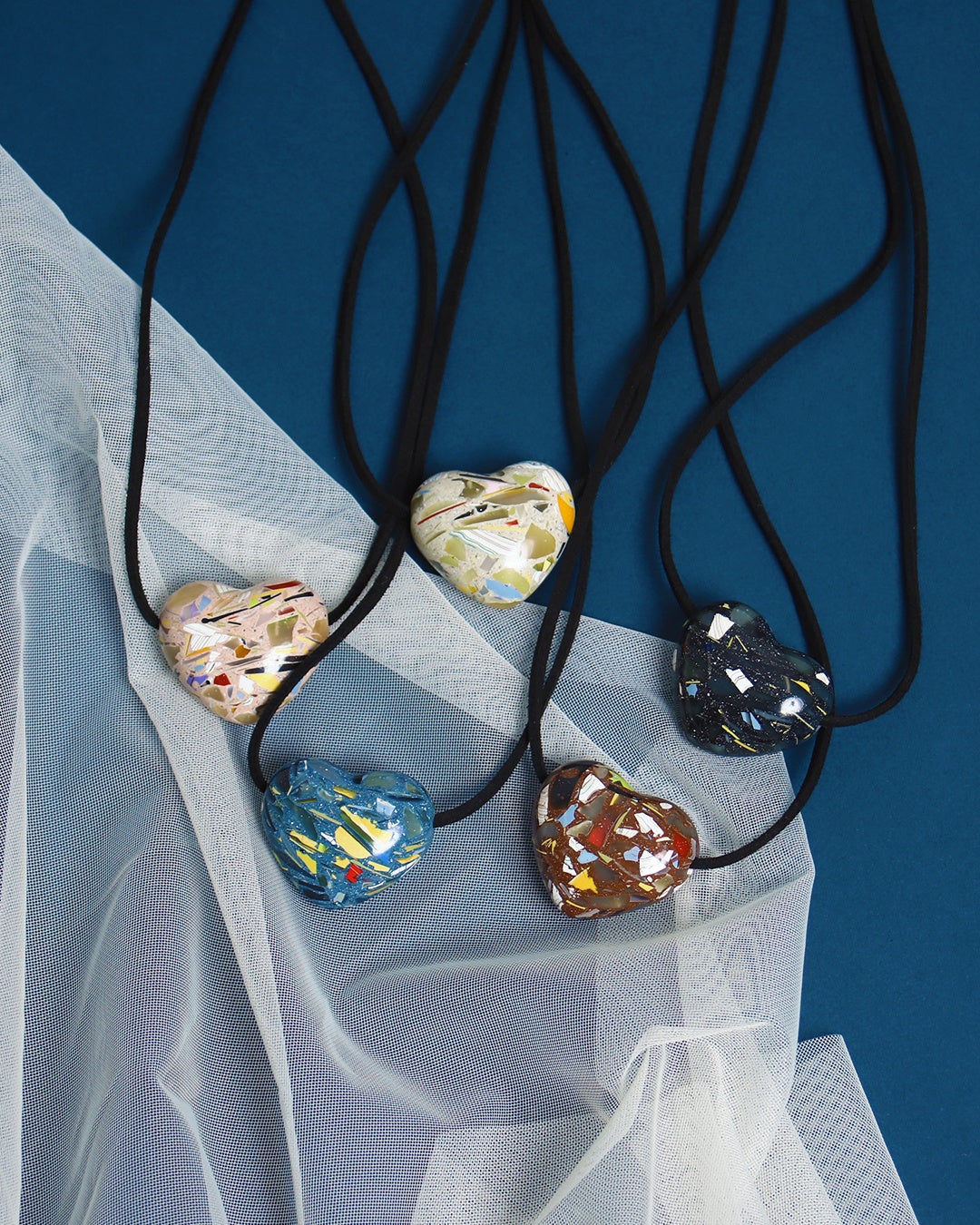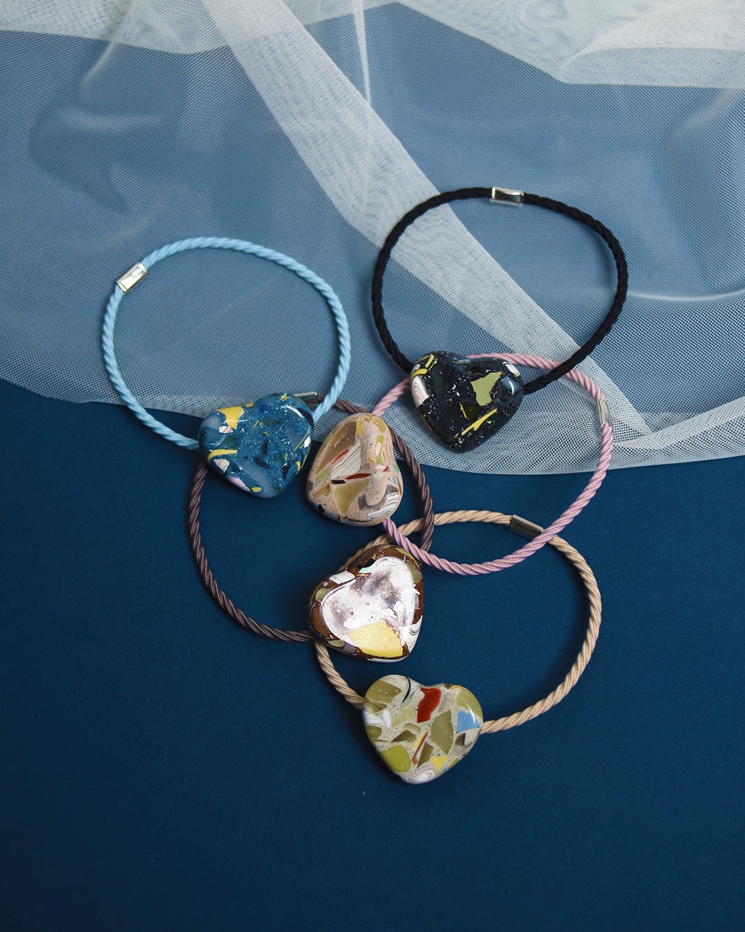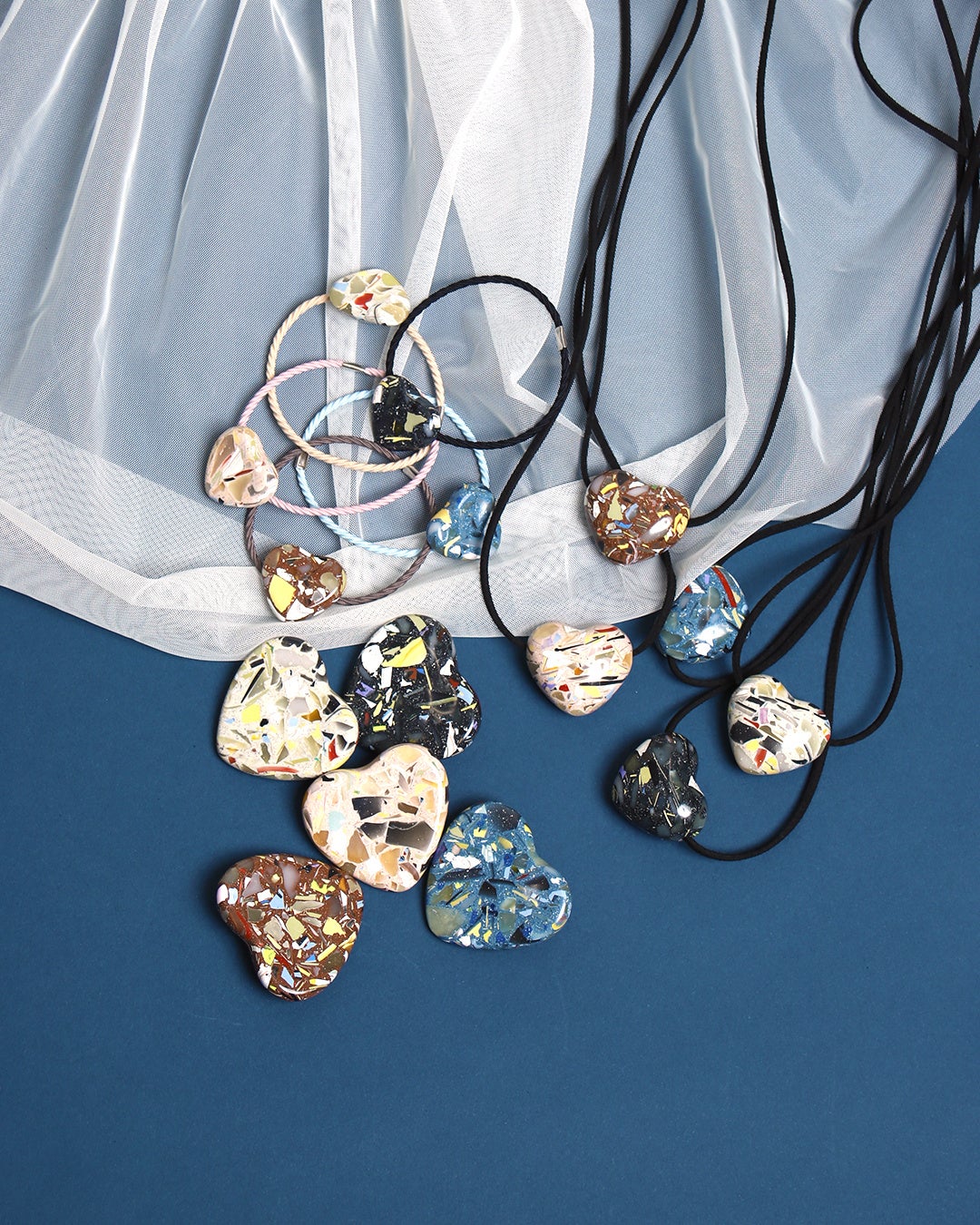 長い時間を経て役目を終えたマネキンの一部をアップサイクルした、ハートをモチーフに3型(ブローチ・ヘアゴム・チョーカー)の別注アイテムを販売します。普段マネキンなどを手掛ける職人がひとつひとつ手作業で形を作っています。見える断面によって模様が異なり、すべて1点ものです。
