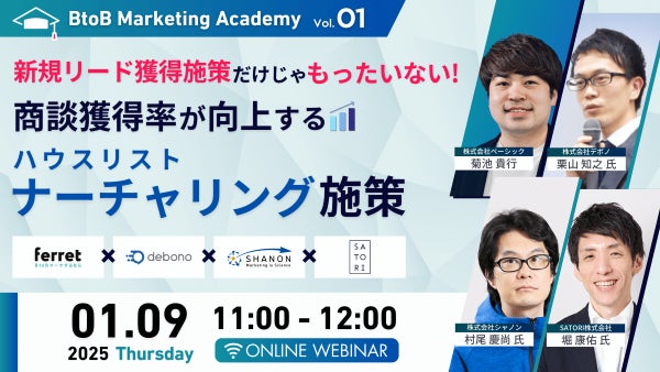 株式会社シャノン(本社:東京都港区、代表取締役:竹田 浩)は、1月9日(木)開催の「商談獲得率が向上するハウスリストナーチャリング施策」をご紹介する共催ウェビナーに登壇します。