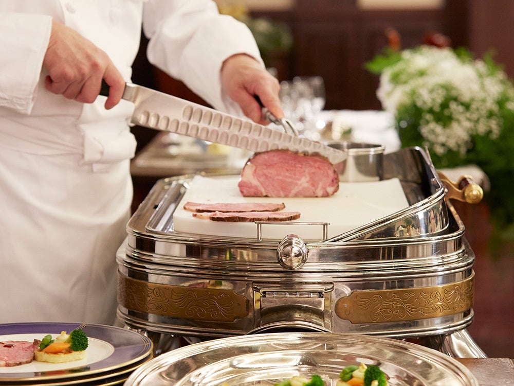 シェフと一緒にローストビーフをカッティングして皿に盛り付けにチャレンジ