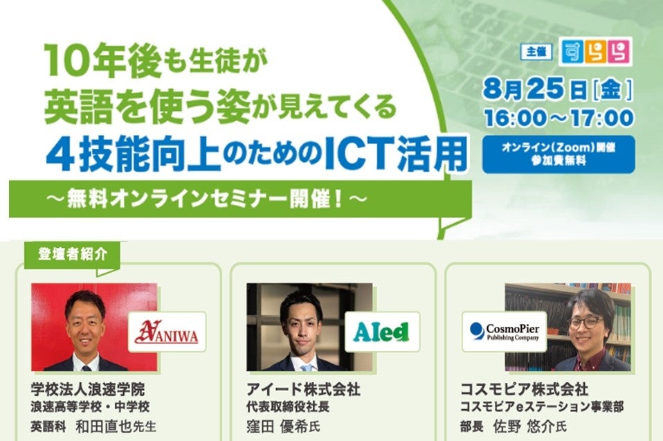 今回のセミナーでは、英語教育に注力している浪速高等学校・中学校から、「表現力が身につく英語授業」をモットーとしている英語科の和田直也先生をお迎えし、「すらら」「スピーキングAI」「eステーション」の活用法とそれによる成果についてご講演いただきます。