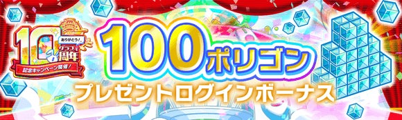 10周年第1弾ではついに極フィーバーフェスに新ユニット『心摯なる永愛女王 リデル』が登場!またログインでポリゴン100個プレゼントなど10周年にちなんだ10大キャンペーンも実施!キャンペーンの一部をご紹介します。
