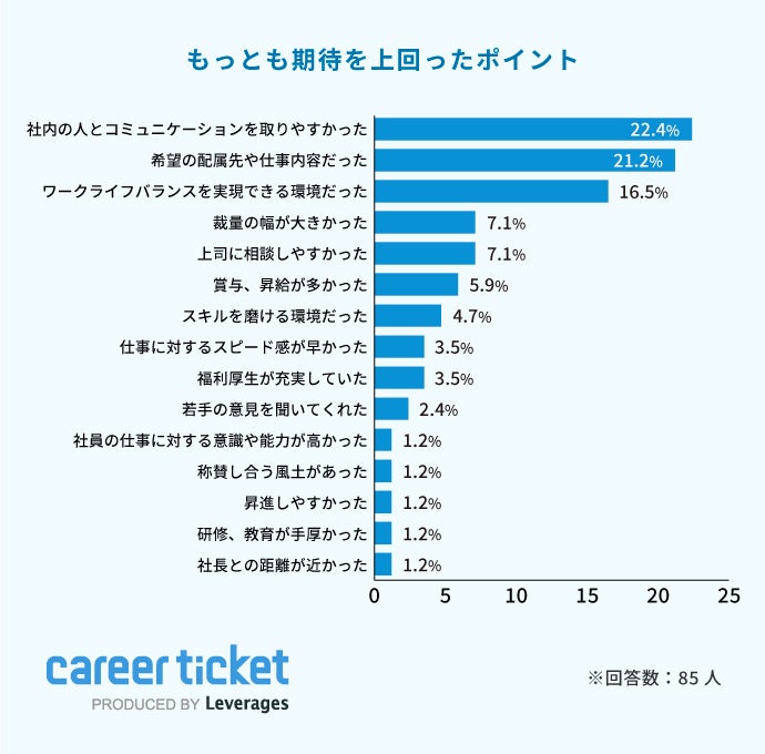 一方、期待を上回るポイントでは、「社内の人とコミュニケーションを取りやすかった(22.4%)」が1位となりました。コロナ禍でリモートワークを導入した企業も多いなか、企業が新入社員とオンライン上でも十分にコミュニケーションをとりやすい環境をつくれていたことが、結果から読み取れます。