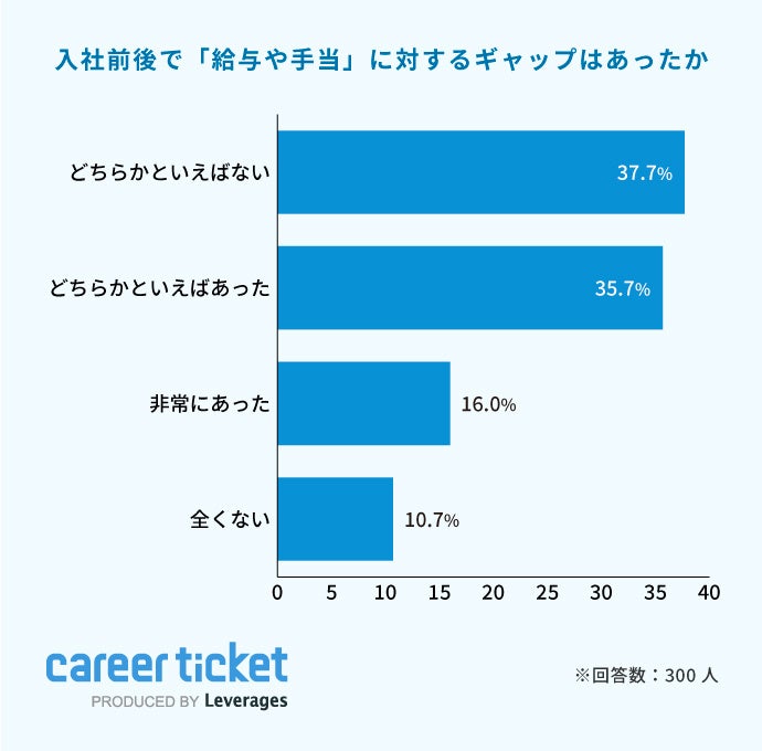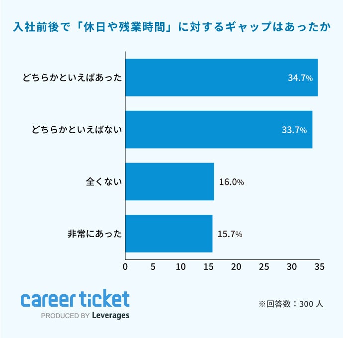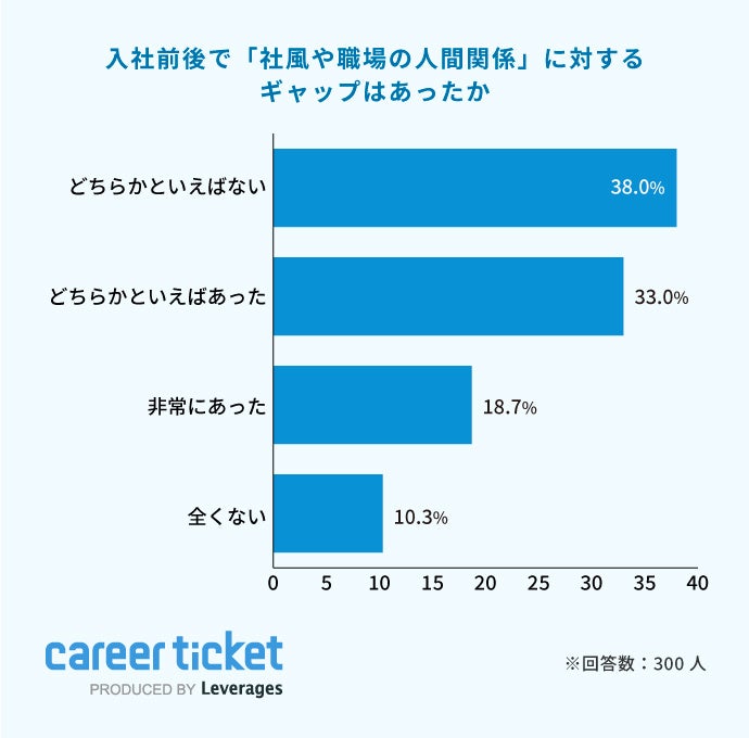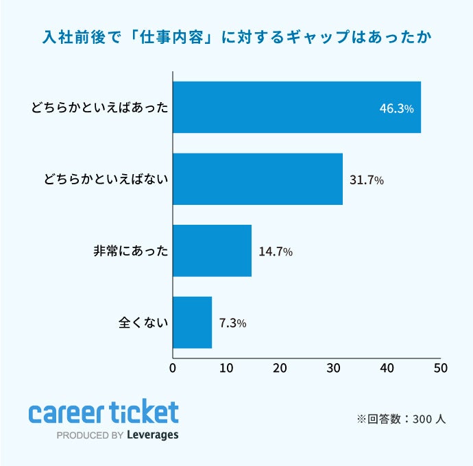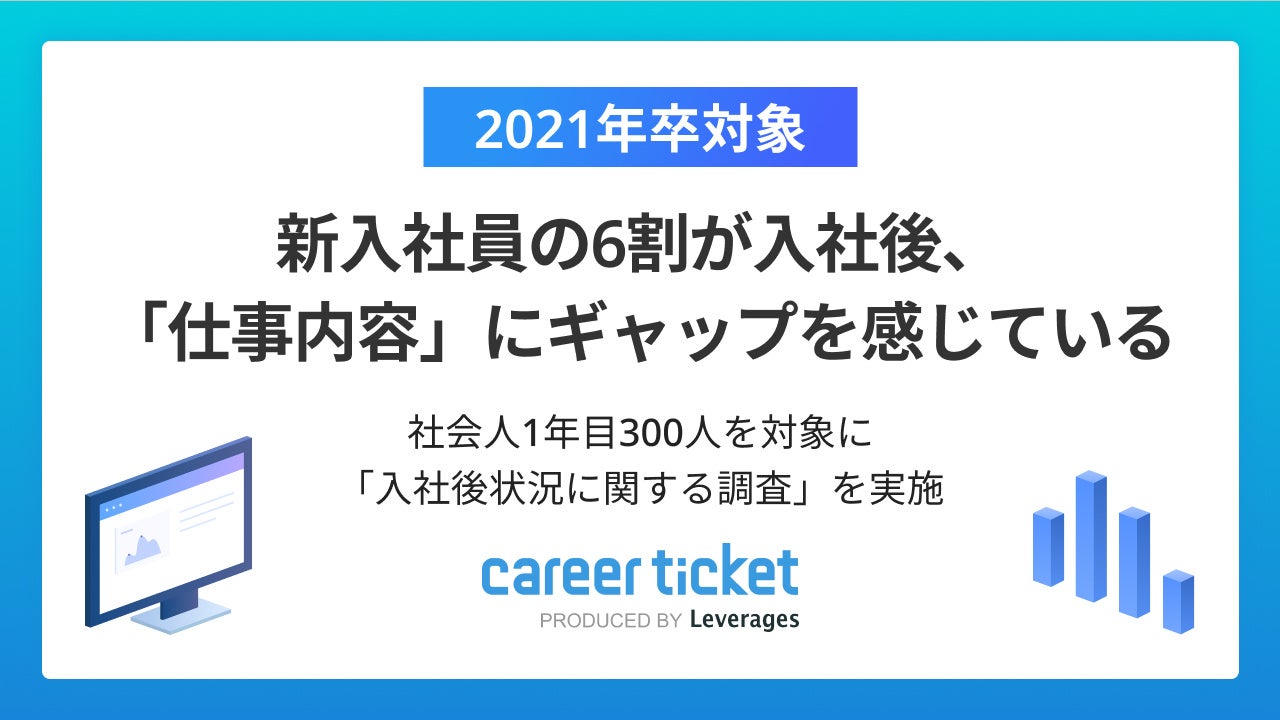 レバレジーズ株式会社が運営する新卒向け就職エージェント「career ticket (キャリアチケット)」は、入社1年目の社員300名を対象に「入社後状況に関する調査」を実施しました。