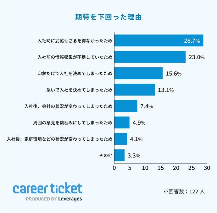 期待を下回ってしまった要因では、「入社時に妥協せざるを得なかったため(28.7%)」、「入社前の情報収集が不足していたため(23.0%)」と続きました。