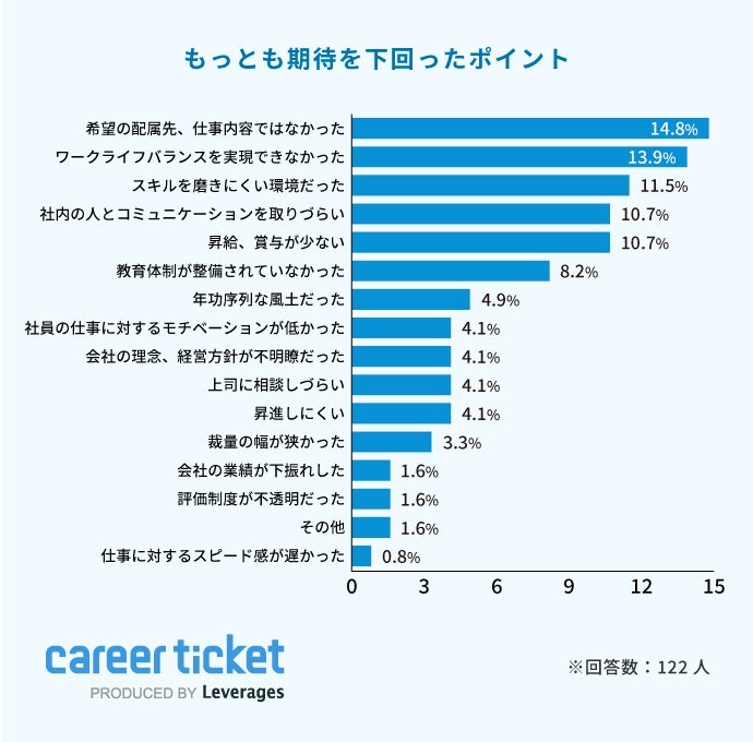 期待を下回ったポイントでは、「希望の配属先、仕事内容ではなかった(14.8%)」「ワークライフバランスを実現できなかった(13.9%)」が上位に挙がっています。