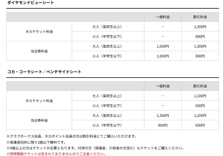 ※特別料金のため、クラブホークス会員、タカポイント会員の割引はございません。
