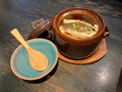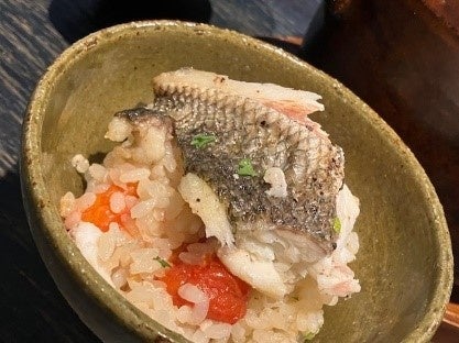 身はしっかりと香ばしさが出るように皮目を焼き,土鍋で炊き上がったご飯に乗せ,チーズをかけ,一緒に蒸らします。蒸らしあがりにイタリアンパセリとコショウをふり完成です。黒鯛の香ばしいふっくらとした身と出汁の効いたご飯とチーズが食欲をそそる一品です。