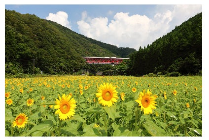 「光と花の舞」 「佐用ひまわり畑と赤い高速道路橋」